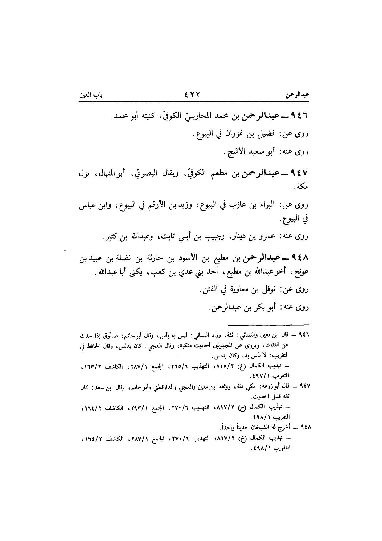 947 - عبد الرحمن بن مطعم الْكُوفِي وَيُقَال الْبَصْرِيّ أَبُو الْمنْهَال نزل مَكَّة