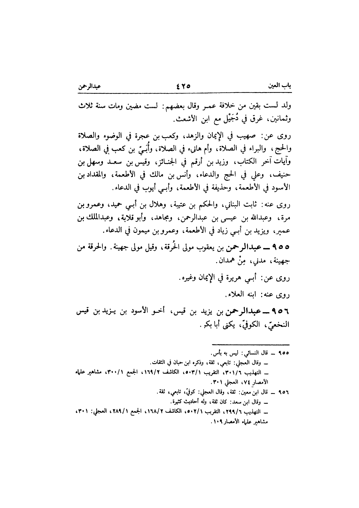 956 - عبد الرحمن بن يزِيد بن قيس أَخُو الْأسود بن يزِيد بن قيس النَّخعِيّ الْكُوفِي يكنى أَبَا بكر