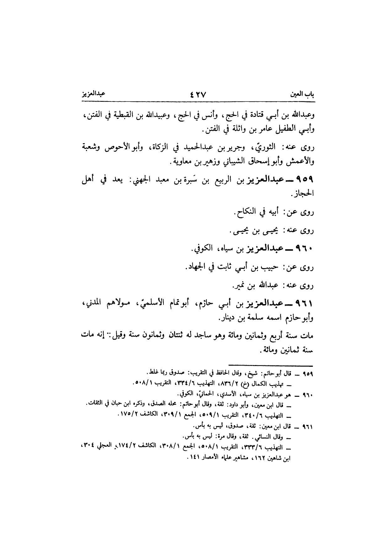 961 - عبد العزيز بن أبي حَازِم أَبُو تَمام الْأَسْلَمِيّ مَوْلَاهُم الْمدنِي وَأَبُو حَازِم اسْمه سَلمَة بن دِينَار