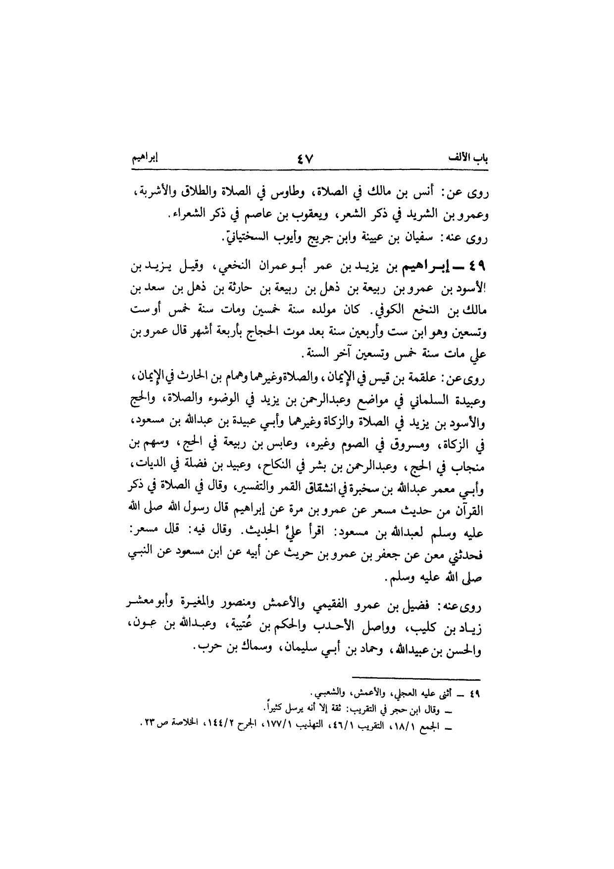 49 - إِبْرَاهِيم بن يزِيد بن عمر أَبُو عمرَان النَّخعِيّ وَقيل يزِيد بن السود بن عَمْرو بن ربيعَة بن ذهل بن ربيعَة بن حَارِثَة بن ذهل بن سعد بن مَالك بن النخع الْكُوفِي كَانَ مولده سنة خمسين وَمَات سنة خمس أَو سِتّ وَتِسْعين وَهُوَ ابْن سِتّ وَأَرْبَعين سنة بعد موت الْحجَّاج بأَرْبعَة أشهر قَالَ عَمْرو بن عَليّ مَاتَ سنة خمس وَتِسْعين آخر السّنة