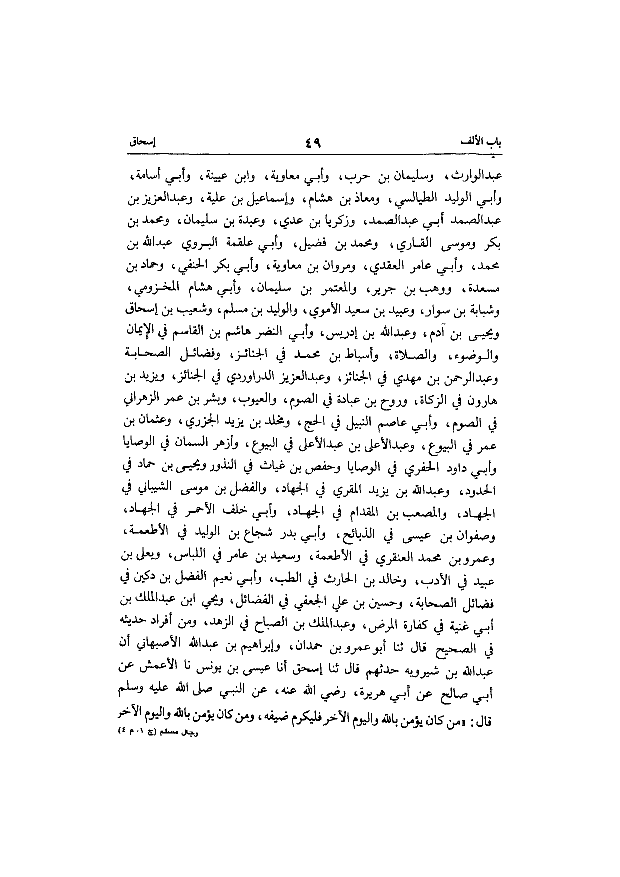 عبد الوارث وَسليمَان بن حَرْب وَأبي مُعَاوِيَة وَابْن عُيَيْنَة وابي أُسَامَة وَأبي الْوَلِيد الطَّيَالِسِيّ ومعاذ بن هِشَام وَإِسْمَاعِيل بن علية وعبد العزيز بن عبد الصمد أبي عبد الصمد وزَكَرِيا بن عدي وَعَبدَة بن سُلَيْمَان وَمُحَمّد بن بكر ومُوسَى الْقَارِي وَمُحَمّد بن فُضَيْل وَأبي عَلْقَمَة البروي عبد الله بن مُحَمَّد وَأبي عَامر الْعَقدي ومروان بن مُعَاوِيَة وَأبي بكر الْحَنَفِيّ وَحَمَّاد بن مسْعدَة ووهب بن جرير والمعتمر بن سُلَيْمَان وَأبي هِشَام المَخْزُومِي وشبابة بن سوار وَعبيد بن سعيد الْأمَوِي والوليد بن مُسلم وَشُعَيْب بن إِسْحَاق وَيحيى بن آدم وعبد الله بن إِدْرِيس وإبي النَّضر هِشَام بن الْقَاسِم فِي الايمان وَالْوُضُوء وَالصَّلَاة وأسباط بن مُحَمَّد فِي الْجَنَائِز وفضائل الصَّحَابَة وعبد الرحمن بن مهْدي فِي الْجَنَائِز وعبد العزيز الدَّرَاورْدِي فِي الْجَنَائِز وَيزِيد بن هَارُون فِي الزَّكَاة وروح بن عبَادَة فِي الصَّوْم والعيوب وَبشر بن عمر الزهْرَانِي فِي الصَّوْم وَأبي عَاصِم النَّبِيل فِي الْحَج ومخلد بن يزِيد الْجَزرِي وَعُثْمَان بن عمر فِي الْبيُوع وعبد الأعلى بن عبد الأعلى فِي الْبيُوع وأزهر السمان فِي الْوَصَايَا وَأبي دَاوُد الْحَفرِي فِي الْوَصَايَا وَحَفْص بن غياث فِي النذور وَيحيى بن حَمَّاد فِي الْحُدُود وعبد الله بن يزِيد الْمقري فِي الْجِهَاد وَالْفضل بن مُوسَى الشَّيْبَانِيّ فِي الْجِهَاد والمصعب بن الْمِقْدَام فِي الْجِهَاد وَأبي خلف الْأَحْمَر فِي الْجِهَاد وَصَفوَان بن عِيسَى فِي الذَّبَائِح وَأبي بدر شُجَاع بن الْوَلِيد فِي الْأَطْعِمَة وَعَمْرو بن مُحَمَّد العنقري فِي الْأَطْعِمَة وَسَعِيد بن عَامر فِي اللبَاس ويعلى بن عبيد فِي الْأَدَب وخَالِد بن الْحَارِث فِي الطِّبّ وَأبي نعيم الْفضل بن دُكَيْن فِي فَضَائِل الصَّحَابَة وحسين بن عَليّ الْجعْفِيّ فِي الْفَضَائِل وَيحيى ابْن عبد الملك بن أبي غنية فِي كَفَّارَة الْمَرَض وعبد الملك بن الصَّباح فِي الزّهْد وَمن أَفْرَاد حَدِيثه فِي الصَّحِيح قَالَ ثَنَا أَبُو عَمْرو بن حمدَان وَإِبْرَاهِيم بن عبد الله الْأَصْبَهَانِيّ أَن عبد الله بن شيرويه حَدثهمْ قَالَ ثَنَا إِسْحَق أَنا عِيسَى بن يُونُس نَا الْأَعْمَش عَن أبي صَالح عَن أبي هُرَيْرَة رَضِي الله عَنهُ عَن النَّبِي صلى الله عَلَيْهِ وَسلم قَالَ من كَانَ يُؤمن بِاللَّه وَالْيَوْم الآخر فَليُكرم ضَيفه وَمن كَانَ يُؤمن بِاللَّه وَالْيَوْم الآخر