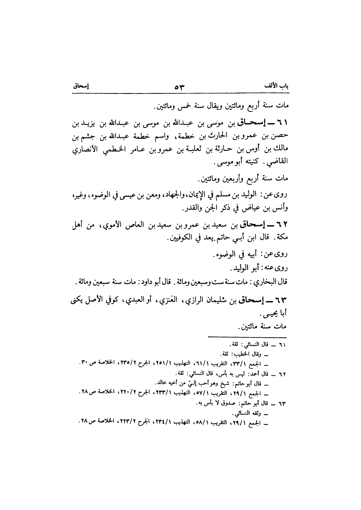 62 - إِسْحَاق بن سعيد بن عَمْرو بن سعيد بن الْعَاصِ الْأمَوِي من أهل مَكَّة قَالَ ابْن أبي حَاتِم يعد فِي الْكُوفِيّين