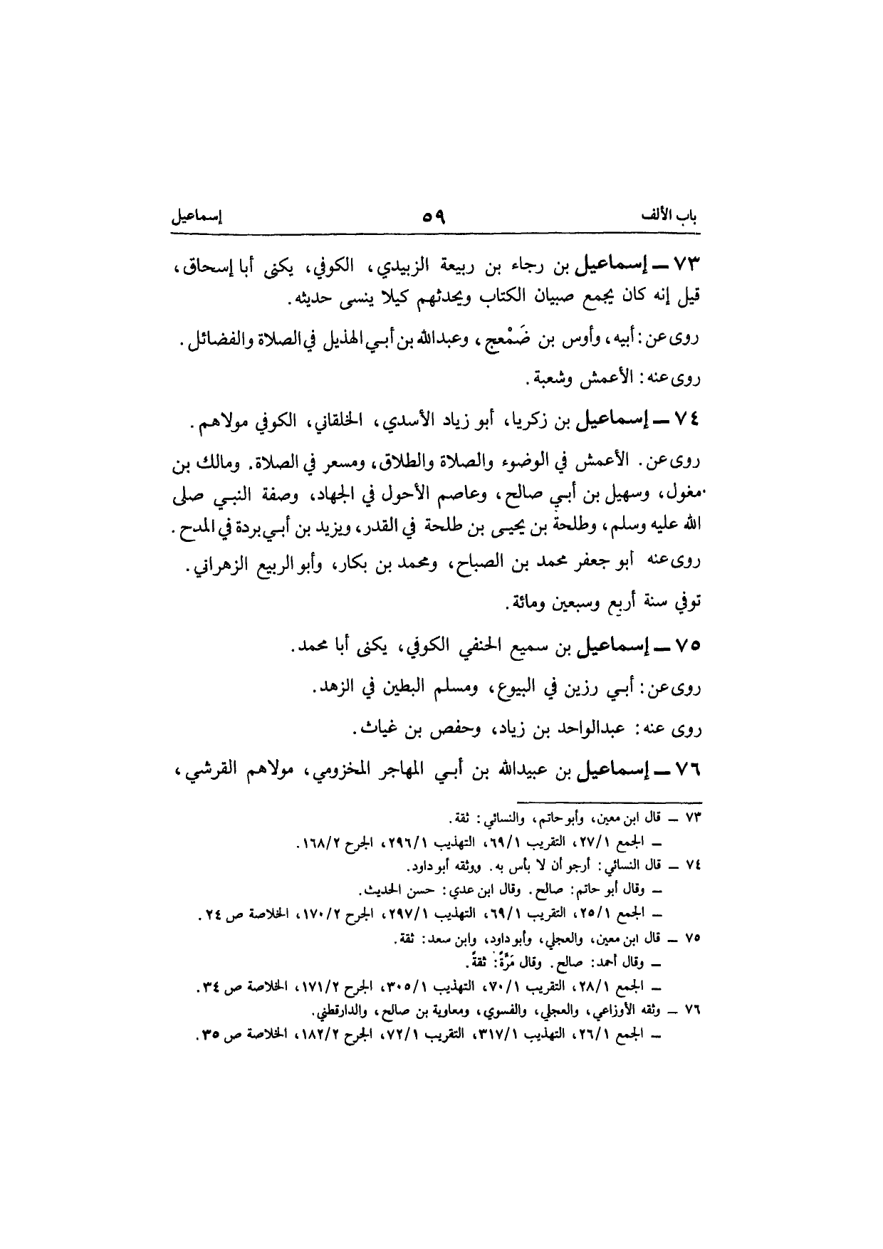 73 - إِسْمَاعِيل بن رَجَاء بن ربيعَة الزبيدِيّ الْكُوفِي يكنى أَبَا إِسْحَاق قيل إِنَّه كَانَ يجمع صبيان الْكتاب ويحدثهم كَيْلا ينسى حَدِيثه