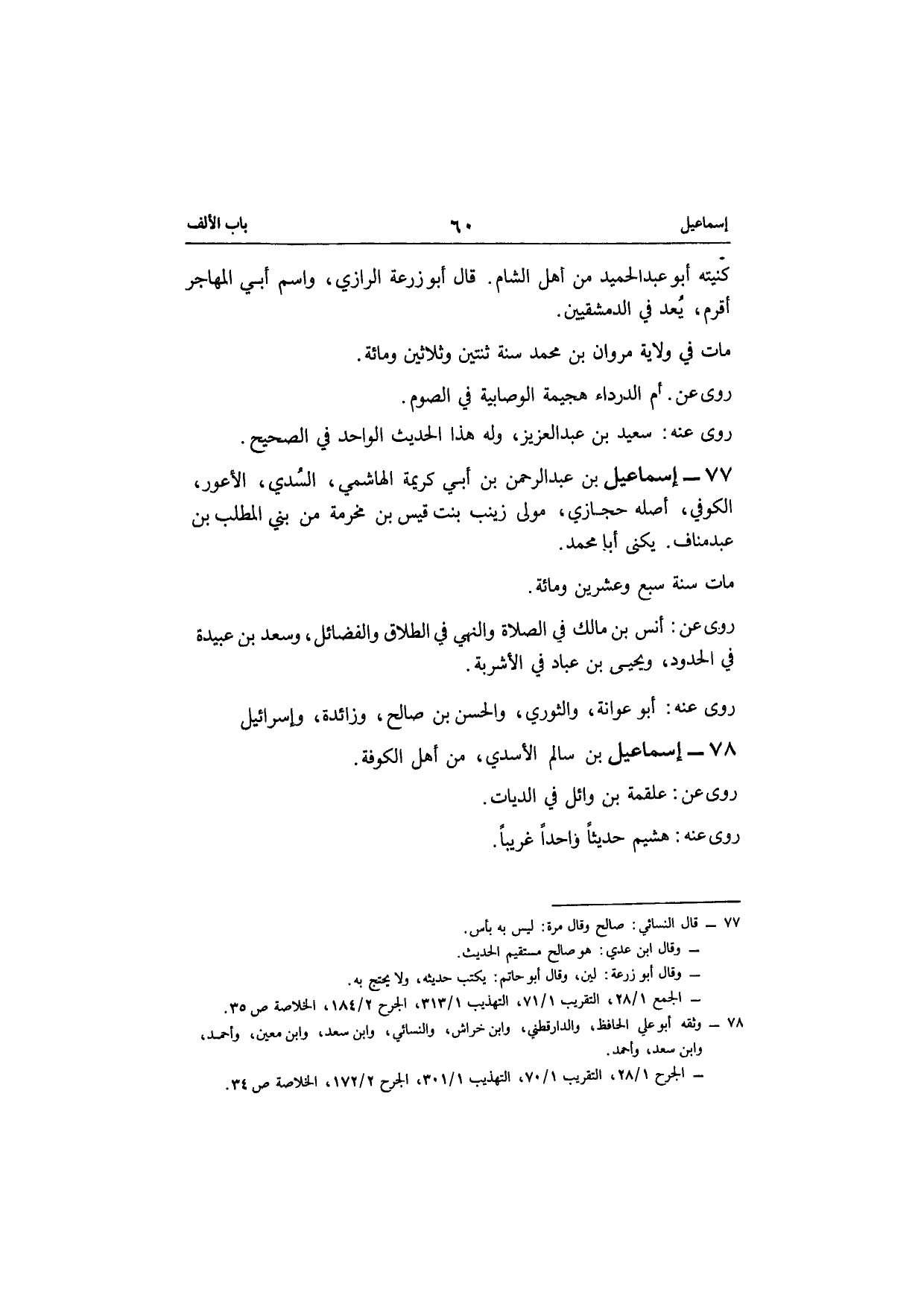 77 - إِسْمَاعِيل بن عبد الرحمن بن أبي كَرِيمَة الْهَاشِمِي السّديّ الْأَعْوَر الْكُوفِي أَصله حجازي مولى زَيْنَب بنت قيس بن مخرمَة من بني الْمطلب بن عبد منَاف يكنى أَبَا مُحَمَّد