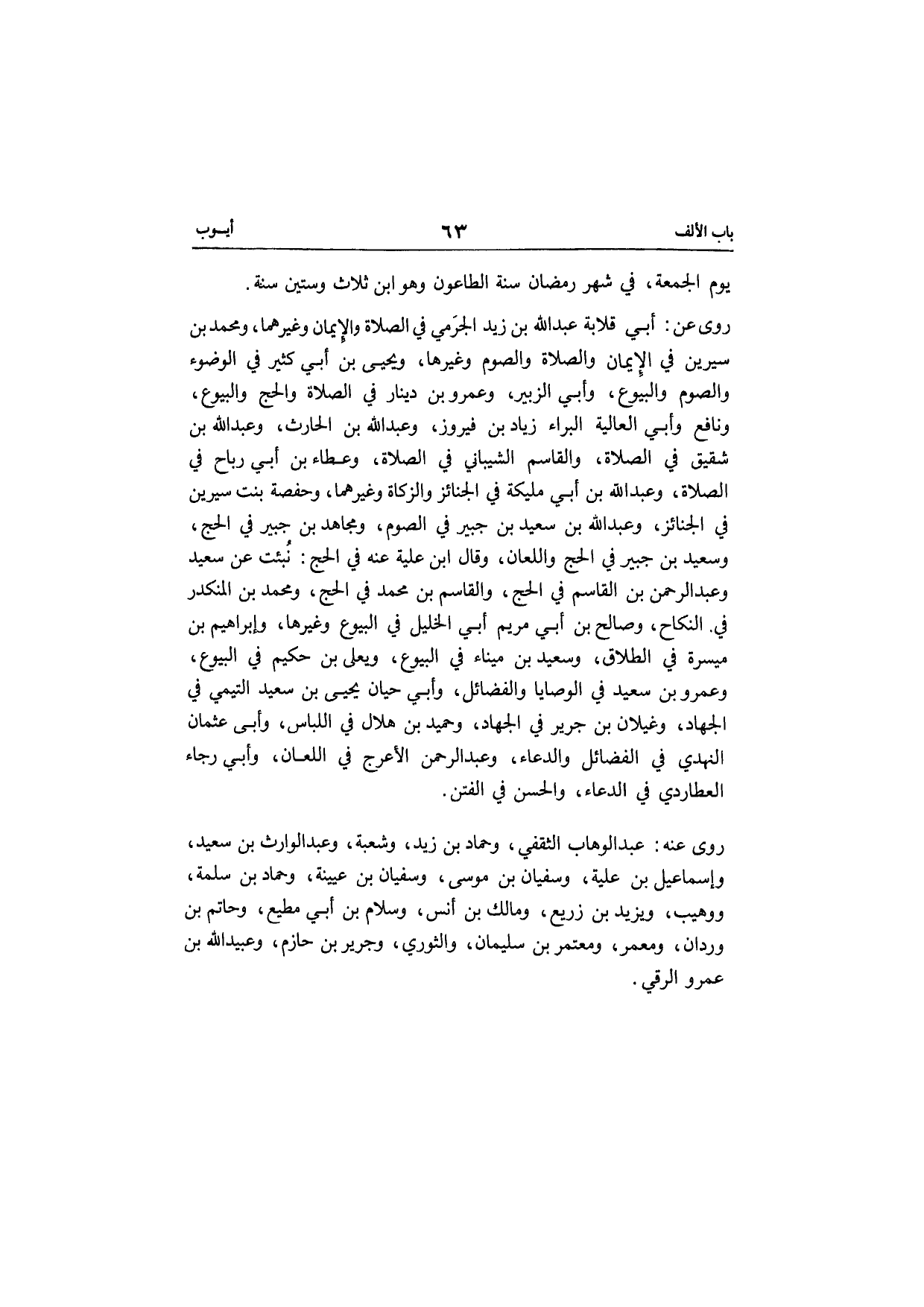 روى عَن أبي قلَابَة عبد الله بن زيد الْجرْمِي فِي الصَّلَاة والايمان وَغَيرهمَا وَمُحَمّد بن سِيرِين فِي الايمان وَالصَّلَاة وَالصَّوْم وَغَيرهَا وَيحيى بن أبي كثير فِي الْوضُوء وَالصَّوْم والبيوع وَأبي الزبير وَعَمْرو بن دِينَار فِي الصَّلَاة وَالْحج والبيوع وَنَافِع وَأبي الْعَالِيَة الْبَراء زِيَاد بن فَيْرُوز وعبد الله بن الْحَارِث وعبد الله بن شَقِيق فِي الصَّلَاة وَالقَاسِم الشَّيْبَانِيّ فِي الصَّلَاة وَعَطَاء بن أبي رَبَاح فِي الصَّلَاة وعبد الله بن أبي مليكَة فِي الْجَنَائِز وَالزَّكَاة وَغَيرهمَا وَحَفْصَة بنت سِيرِين فِي الْجَنَائِز وعبد الله بن سعيد بن جُبَير فِي الصَّوْم وَمُجاهد بن جُبَير فِي الْحَج وَسَعِيد بن جُبَير فِي الْحَج وَاللّعان وَقَالَ ابْن علية عَنهُ فِي الْحَج نبئت عَن سعيد وعبد الرحمن بن الْقَاسِم فِي الْحَج وَالقَاسِم بن مُحَمَّد فِي الْحَج وَمُحَمّد بن الْمُنْكَدر فِي النِّكَاح وَصَالح بن أبي مَرْيَم أبي الْخَلِيل فِي الْبيُوع وَغَيرهَا وابراهيم بن ميسرَة فِي الطَّلَاق وَسَعِيد بن ميناء فِي الْبيُوع ويعلى بن حَكِيم فِي الْبيُوع وَعَمْرو بن سعيد فِي الْوَصَايَا والفضائل وابي حَيَّان يحيى بن سعيد التَّيْمِيّ فِي الْجِهَاد وغيلان بن جرير فِي الْجِهَاد وَحميد بن هِلَال فِي اللبَاس وَأبي عُثْمَان النَّهْدِيّ فِي الْفَضَائِل وَالدُّعَاء وعبد الرحمن الْأَعْرَج فِي اللّعان وَأبي رَجَاء العطاردي فِي الدُّعَاء وَالْحسن فِي الْفِتَن