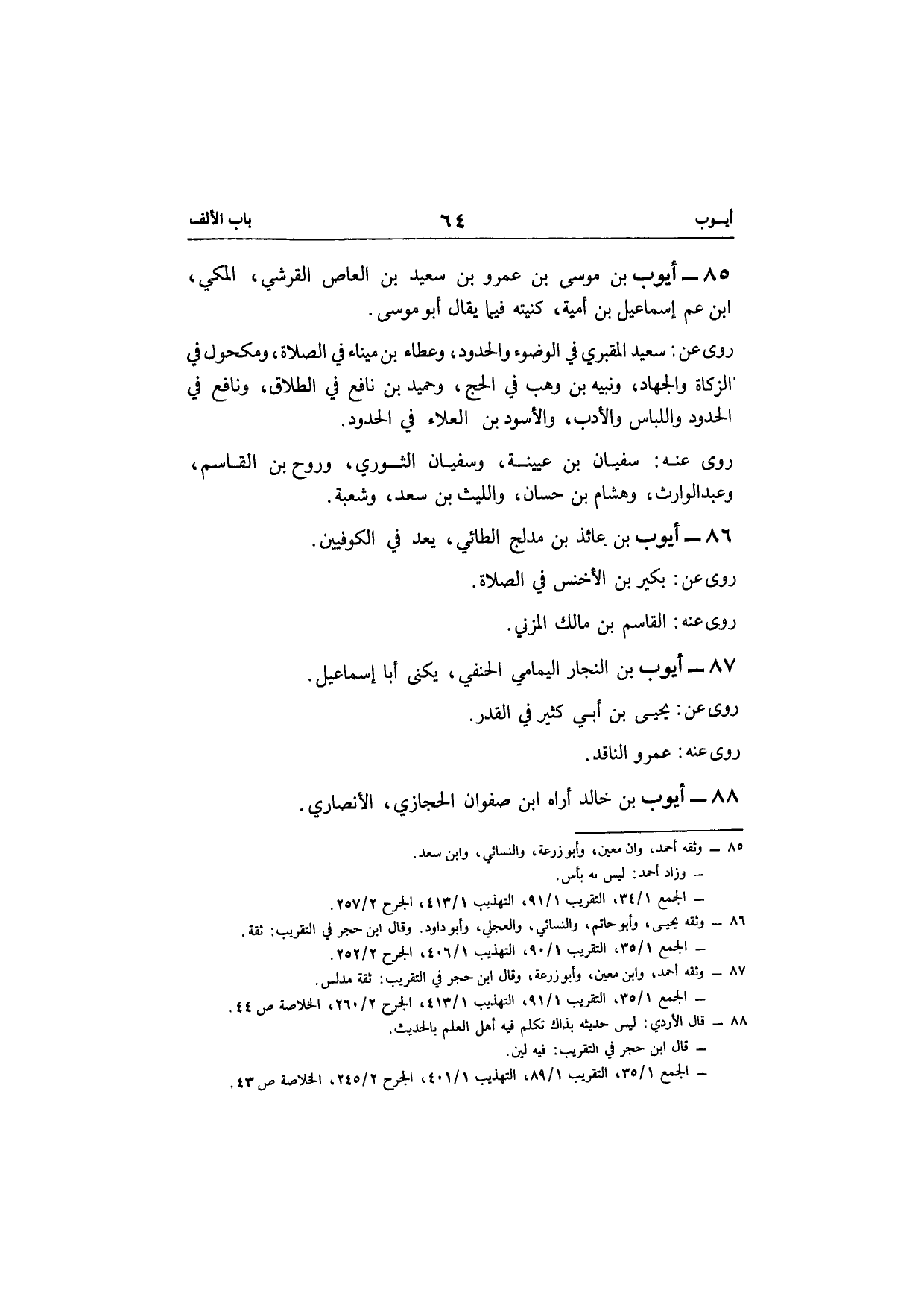 85 - أَيُّوب بن مُوسَى بن عَمْرو بن سعيد بن الْعَاصِ الْقرشِي الْمَكِّيّ ابْن عَم إِسْمَاعِيل بن أُميَّة كنيته فِيمَا يُقَال أَبُو مُوسَى
