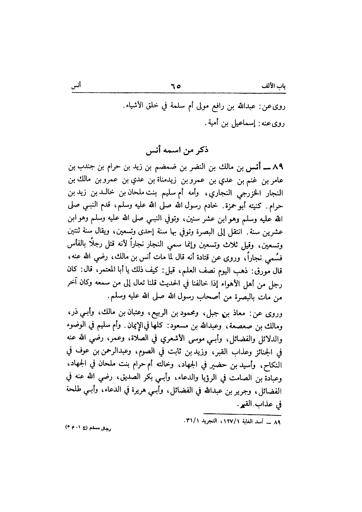 89 - أنس بن مَالك بن النَّضر بن ضَمْضَم بن زيد بن حرَام بن جُنْدُب بن عَامر بن غنم بن عدي بن عَمْرو بن زيدمناة بن عدي بن عَمْرو بن مَالك بن النجار الخزرجي النجاري وَأمه أم سليم بنت ملْحَان بن خَالِد بن زيد بن حرَام كنيته أَبُو حَمْزَة خَادِم رَسُول الله صلى الله عَلَيْهِ وَسلم قدم النَّبِي صلى الله عَلَيْهِ وَسلم وَهُوَ ابْن عشر سِنِين وَتُوفِّي النَّبِي صلى الله عَلَيْهِ وَسلم وَهُوَ ابْن عشْرين سنة انْتقل الى الْبَصْرَة وَتُوفِّي بهَا سنة إِحْدَى وَتِسْعين وَيُقَال سنة ثِنْتَيْنِ وَتِسْعين وَقيل ثَلَاث وَتِسْعين وَإِنَّمَا سمي النجار نجارا لِأَنَّهُ قتل رجلا بالفأس فَسُمي نجارا وروى عَن قَتَادَة أَنه قَالَ لما مَاتَ أنس بن مَالك رَضِي الله عَنهُ قَالَ مُورق ذهب الْيَوْم نصف الْعلم قيل كَيفَ ذَلِك يَا أَبَا الْمُعْتَمِر قَالَ كَانَ رجل من أهل الْأَهْوَاء إِذا خَالَفنَا فِي الحَدِيث قُلْنَا تعال إِلَى من سَمعه وَكَانَ آخر من مَاتَ بِالْبَصْرَةِ من أَصْحَاب رَسُول الله صلى الله عَلَيْهِ وَسلم