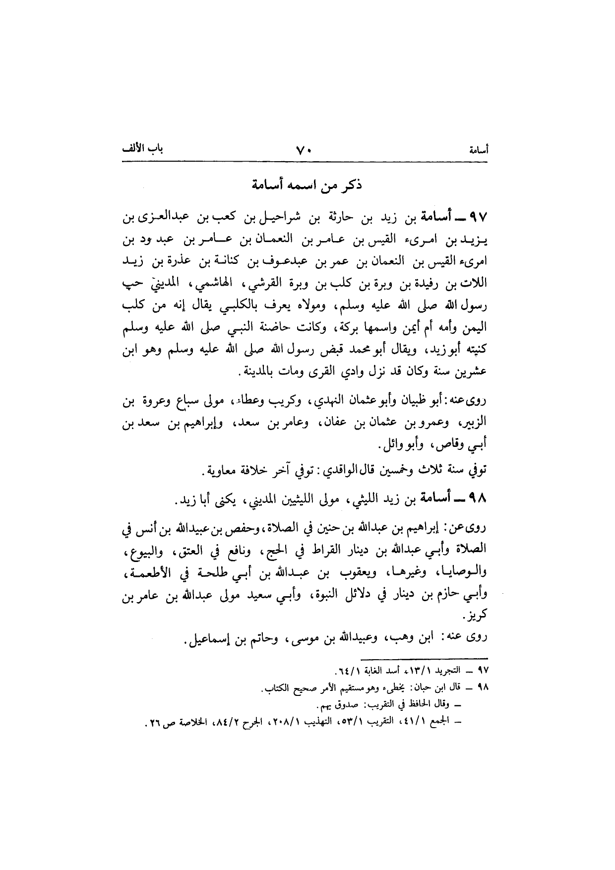 97 - أُسَامَة بن زيد بن حَارِثَة بن شرَاحِيل بن كَعْب بن عبد العزى بن يزِيد بن امرىء الْقَيْس بن عَامر بن النُّعْمَان بن عَامر بن عبد ود بن امرىء الْقَيْس بن النُّعْمَان بن عمر بن عبدعوف بن كنَانَة بن عذرة بن زيد اللات بن رفيدة بن وبرة بن كلب بن وبرة الْقرشِي الْهَاشِمِي الْمَدِينِيّ حب رَسُول الله صلى الله عَلَيْهِ وَسلم ومولاه يعرف بالكلبي يُقَال إِنَّه من كلب الْيمن وَأمه أم أَيمن وَاسْمهَا بركَة وَكَانَت حاضنة النَّبِي صلى الله عَلَيْهِ وَسلم كنيته أَبُو زيد وَيُقَال أَبُو مُحَمَّد قبض رَسُول الله صلى الله عَلَيْهِ وَسلم وَهُوَ ابْن عشْرين سنة وَكَانَ قد نزل وَادي الْقرى وَمَات بِالْمَدِينَةِ