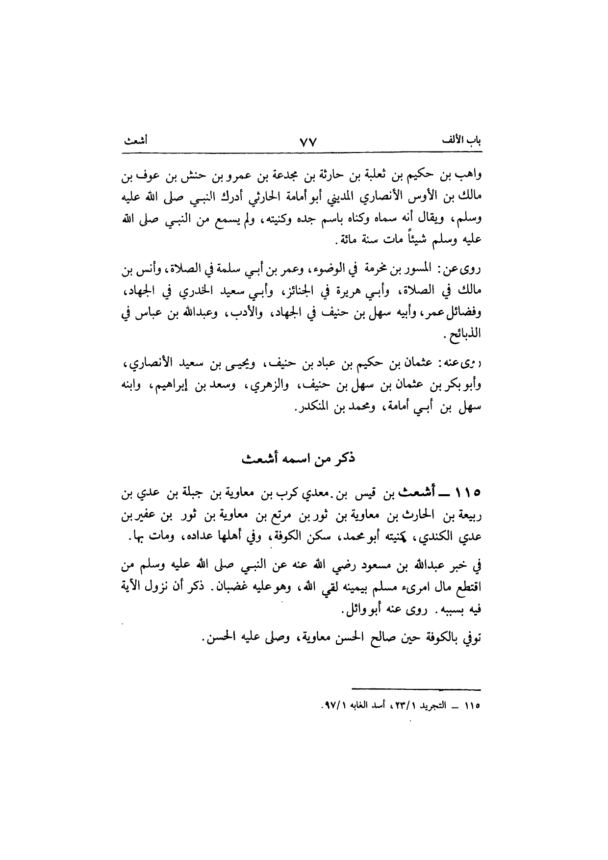 115 - أَشْعَث بن قيس بن معدي كرب بن مُعَاوِيَة بن جبلة بن عدي بن ربيعَة بن الْحَارِث بن مُعَاوِيَة بن ثَوْر بن مرتع بن مُعَاوِيَة بن ثَوْر بن عفير بن عدي الْكِنْدِيّ كنيته أَبُو مُحَمَّد سكن الْكُوفَة وَفِي أَهلهَا عداده وَمَات بهَا