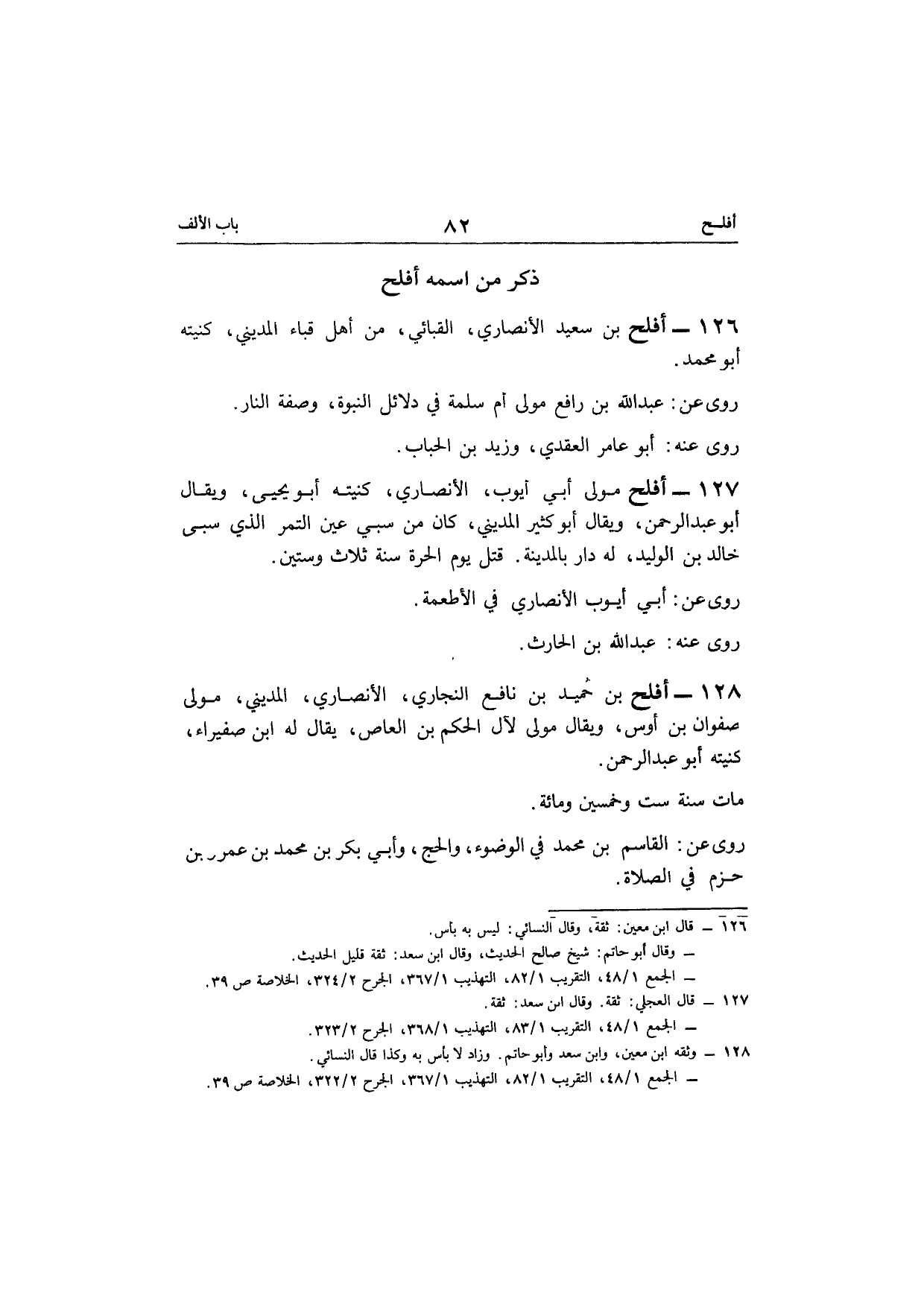 128 - أَفْلح بن حميد بن نَافِع النجاري الْأنْصَارِيّ الْمَدِينِيّ مولى صَفْوَان بن أَوْس وَيُقَال مولى لآل الحكم بن الْعَاصِ وَيُقَال لَهُ ابْن صفيراء كنيته أَبُو عبد الرحمن
