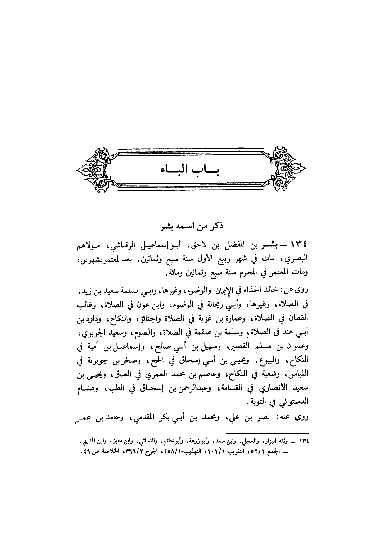 134 - بشر بن الْمفضل بن لَاحق أَبُو إِسْمَاعِيل الرقاشِي مَوْلَاهُم الْبَصْرِيّ مَاتَ فِي شهر ربيع الأول سنة سبع وَثَمَانِينَ بعد الْمُعْتَمِر بشهرين وَمَات الْمُعْتَمِر فِي الْمحرم سنة سبع وَثَمَانِينَ وَمِائَة