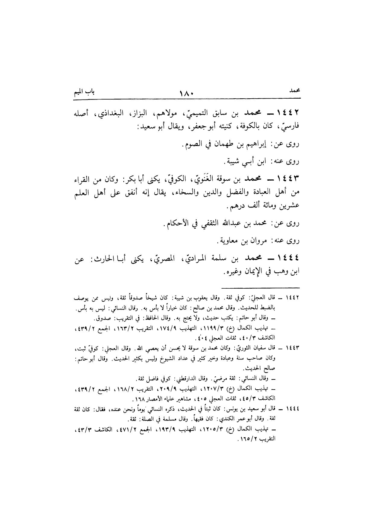 1442 - مُحَمَّد بن سَابق التَّمِيمِي مَوْلَاهُم الْبَزَّاز البغداذي أَصله فَارسي كَانَ بِالْكُوفَةِ كنيته أَبُو جَعْفَر وَيُقَال أَبُو سعيد