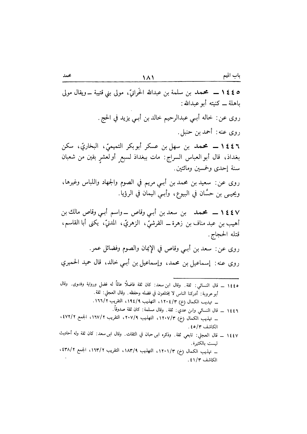 1447 - مُحَمَّد بن سعد بن أبي وَقاص وَاسم أبي وَقاص مَالك بن أهيب بن عبد منَاف بن زهرَة الْقرشِي الزُّهْرِيّ الْمدنِي يكنى ابا الْقَاسِم قَتله الْحجَّاج