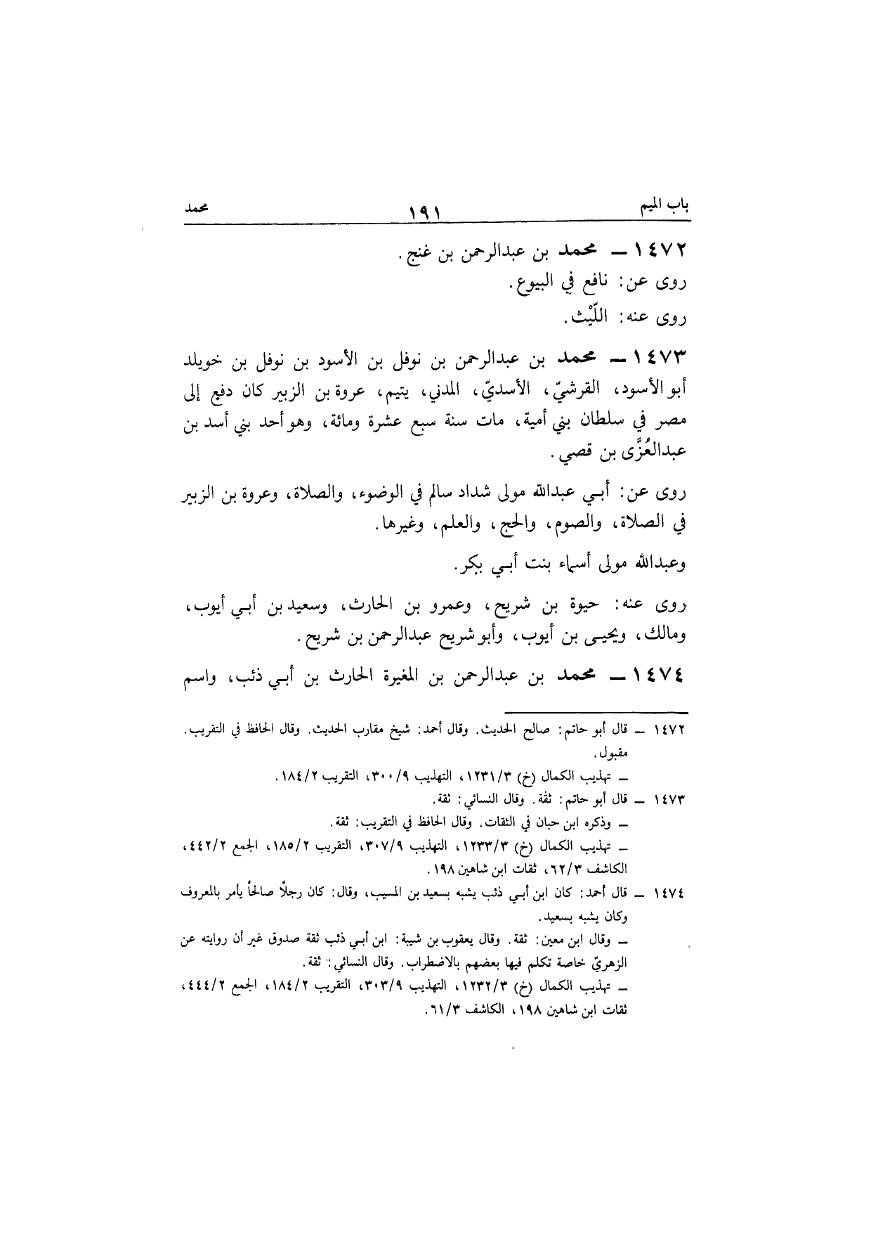 1474 - مُحَمَّد بن عبد الرحمن بن نَوْفَل بن الْأسود بن نَوْفَل بن خويلد أَبُو الْأسود الْقرشِي الْأَسدي الْمدنِي يَتِيم عُرْوَة بن الزبير كَانَ دفع إِلَى مصر فِي سُلْطَان بني أُميَّة مَاتَ سنة سبع عشرَة وَمِائَة وَهُوَ أحد بني أَسد بن عبد العزى بن قصي