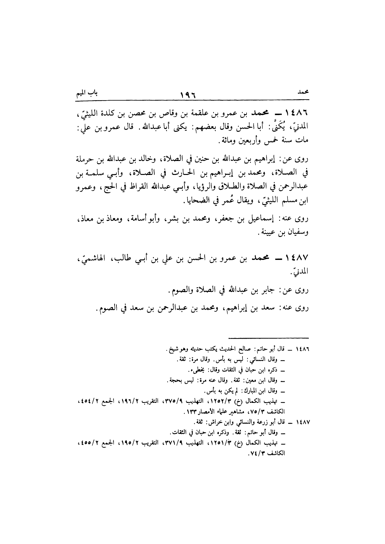 1486 - مُحَمَّد بن عَمْرو بن عَلْقَمَة بن وَقاص بن مُحصن بن كلدة اللَّيْثِيّ الْمدنِي يكنى أَبَا الْحسن وَقَالَ بَعضهم يكنى أَبَا عبد الله قَالَ عَمْرو بن عَليّ مَاتَ سنة خمس وَأَرْبَعين وَمِائَة