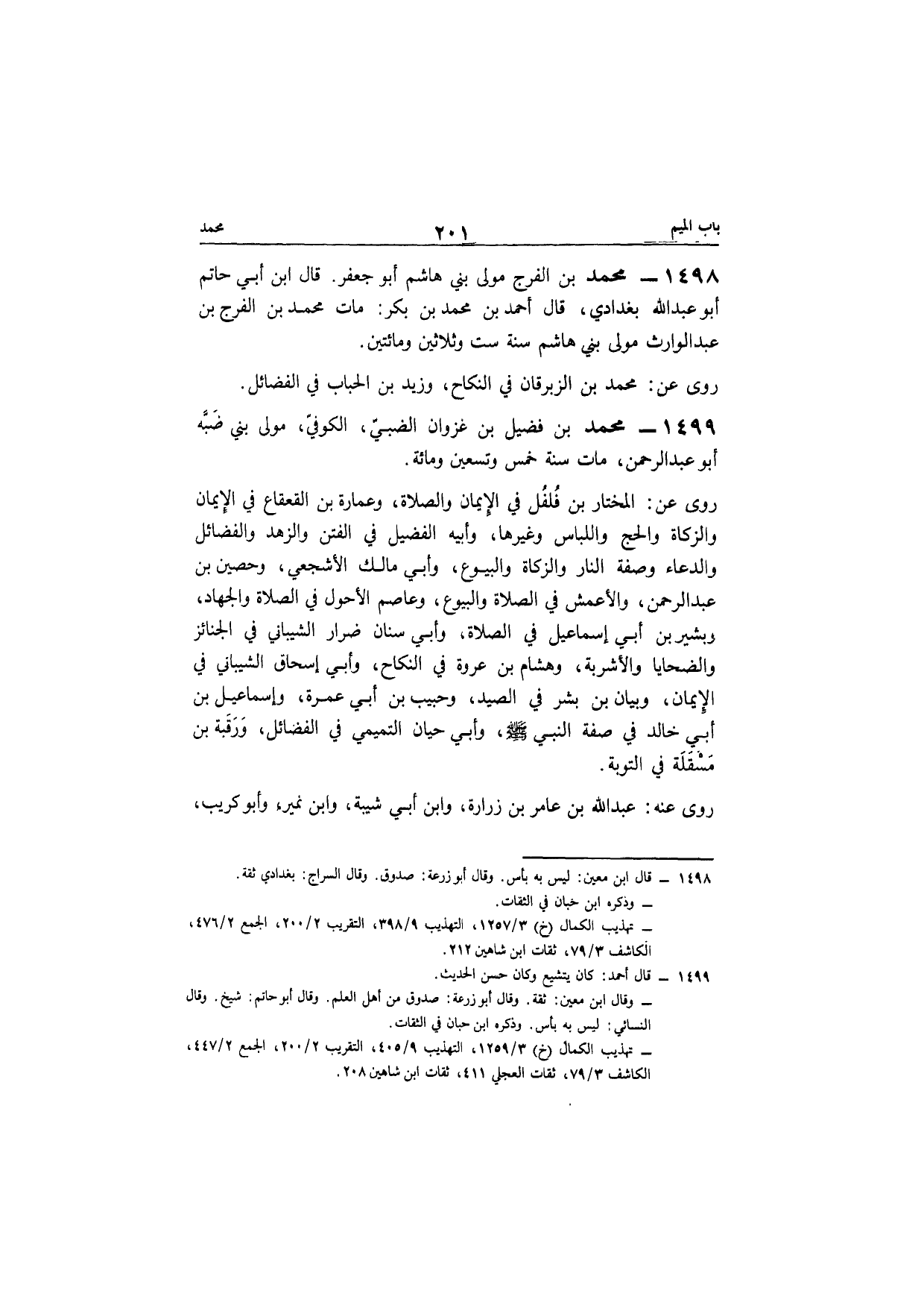1499 - مُحَمَّد بن فُضَيْل بن غَزوَان الضَّبِّيّ الْكُوفِي مولى بني ضبه أَبُو عبد الرحمن مَاتَ سنة خمس وَتِسْعين وَمِائَة