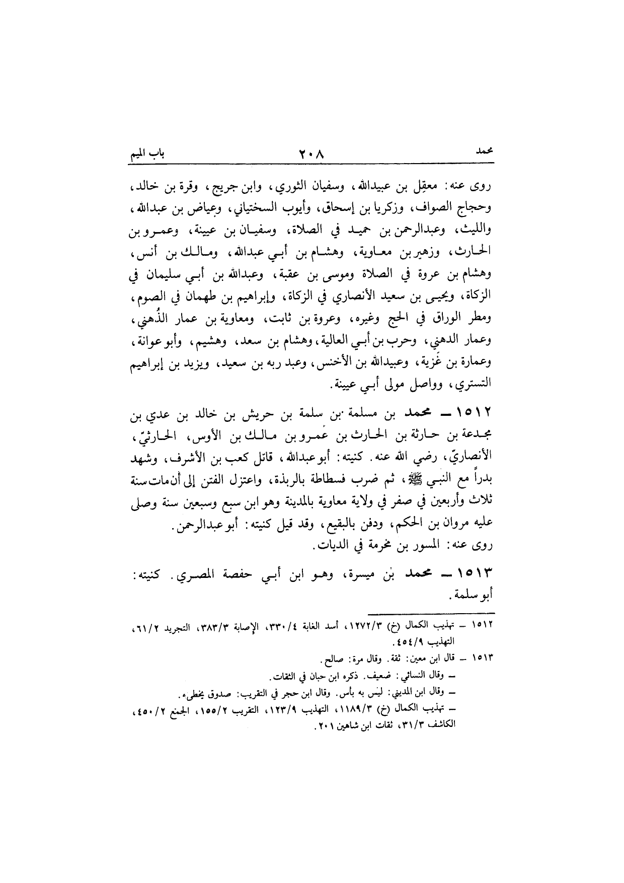 1512 - مُحَمَّد بن مسلمة بن سَلمَة بن حريش بن خَالِد بن عدي بن مجدعة بن حَارِثَة بن الْحَارِث بن عَمْرو بن مَالك بن الْأَوْس الْحَارِثِيّ الْأنْصَارِيّ رَضِي الله عَنهُ كنيته أَبُو عبد الله قَاتل كَعْب بن الْأَشْرَف وَشهد بَدْرًا مَعَ النَّبِي صلى الله عَلَيْهِ وَسلم ثمَّ ضرب فسطاطة بالربذة وَاعْتَزل الْفِتَن إِلَى أَن مَاتَ سنة ثَلَاث وَأَرْبَعين فِي صفر فِي ولَايَة مُعَاوِيَة بِالْمَدِينَةِ وهوابن سبع وَسبعين سنة وَصلى عَلَيْهِ مَرْوَان بن الحكم وَدفن بِالبَقِيعِ وَقد قيل كنيته أَبُو عبد الرحمن