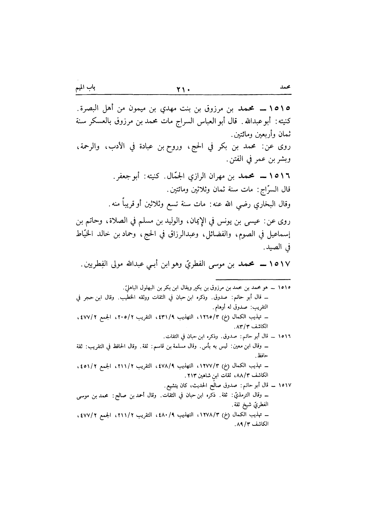 1516 - مُحَمَّد بن مهْرَان الرَّازِيّ الْجمال كنيته أَبُو جَعْفَر