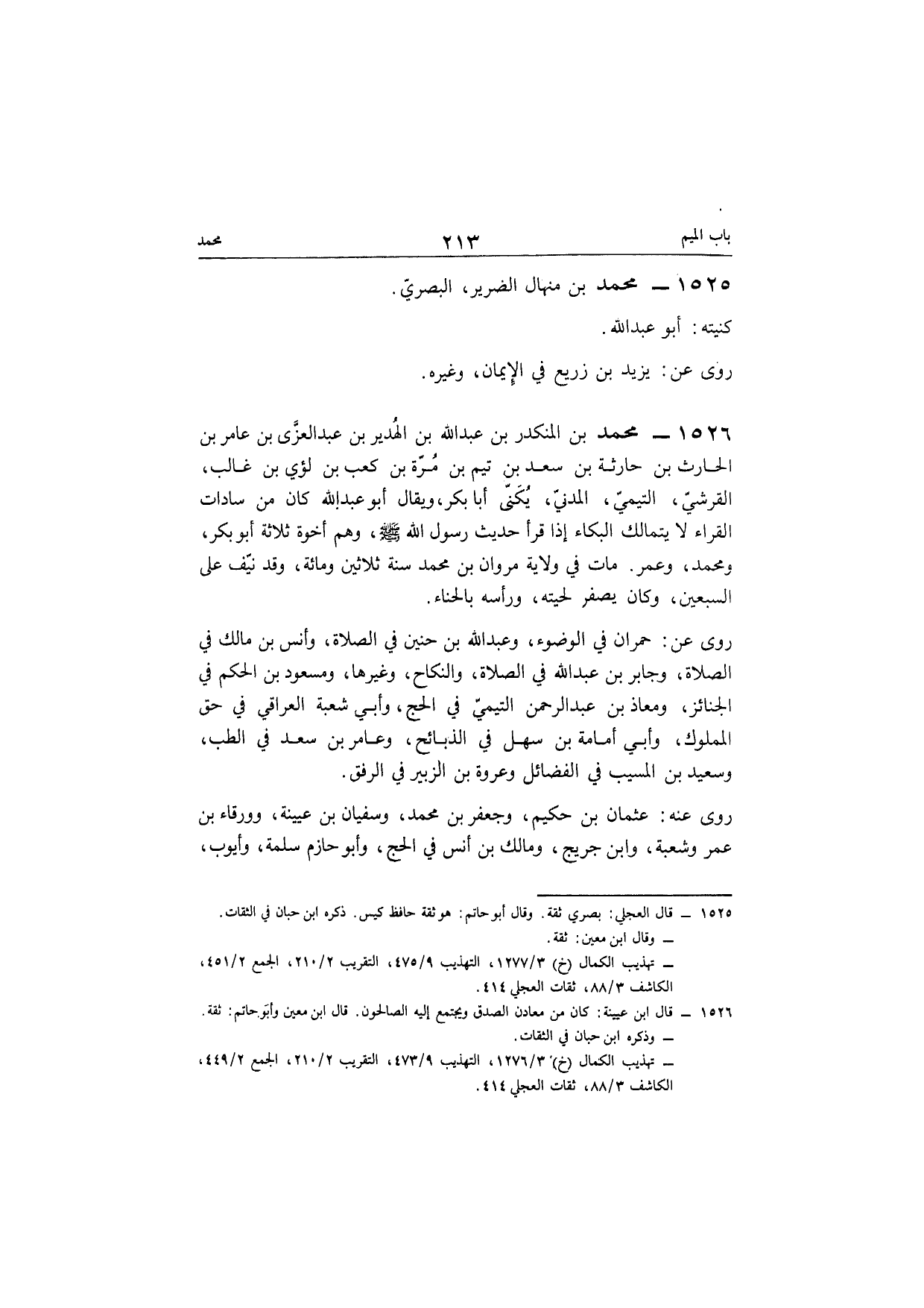 1526 - مُحَمَّد بن الْمُنْكَدر بن عبد الله بن الهدير بن عبد العزى بن عَامر بن الْحَارِث بن حَارِثَة بن سعد بن تيم بن مرّة بن كَعْب بن لؤَي بن غَالب الْقرشِي التَّيْمِيّ الْمدنِي يكنى أَبَا بكر وَيُقَال أَبُو عبد الله كَانَ من سَادَات الْقُرَّاء لَا يَتَمَالَك الْبكاء إِذا قَرَأَ حَدِيث رَسُول الله صلى الله عَلَيْهِ وَسلم وهم أخوة ثَلَاثَة أَبُو بكر وَمُحَمّد وَعمر مَاتَ فِي ولَايَة مَرْوَان بن مُحَمَّد سنة ثَلَاثِينَ وَمِائَة وَقد نَيف على السّبْعين وَكَانَ يصفر لحيته وَرَأسه بِالْحِنَّاءِ