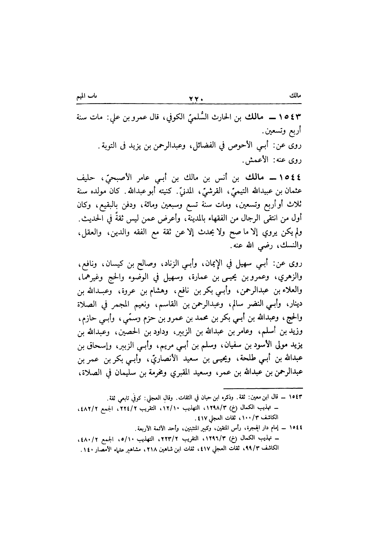 1544 - مَالك بن أنس بن مَالك بن أبي عَامر الأصبحي حَلِيف عُثْمَان بن عبيد الله التَّيْمِيّ الْقرشِي الْمدنِي كنيته أَبُو عبد الله كَانَ مولده سنة ثَلَاث أَو أَربع وَتِسْعين وَمَات سنة تسع وَسبعين وَمِائَة وَدفن بِالبَقِيعِ وَكَانَ أول من انتقى الرِّجَال من الْفُقَهَاء بِالْمَدِينَةِ وَأعْرض عَمَّن لَيْسَ ثِقَة فِي الحَدِيث وَلم يكن يروي إِلَّا مَا صَحَّ وَلَا يحدث إِلَّا عَن ثِقَة مَعَ الْفِقْه وَالدّين وَالْعقل والنسك رَضِي الله عَنهُ