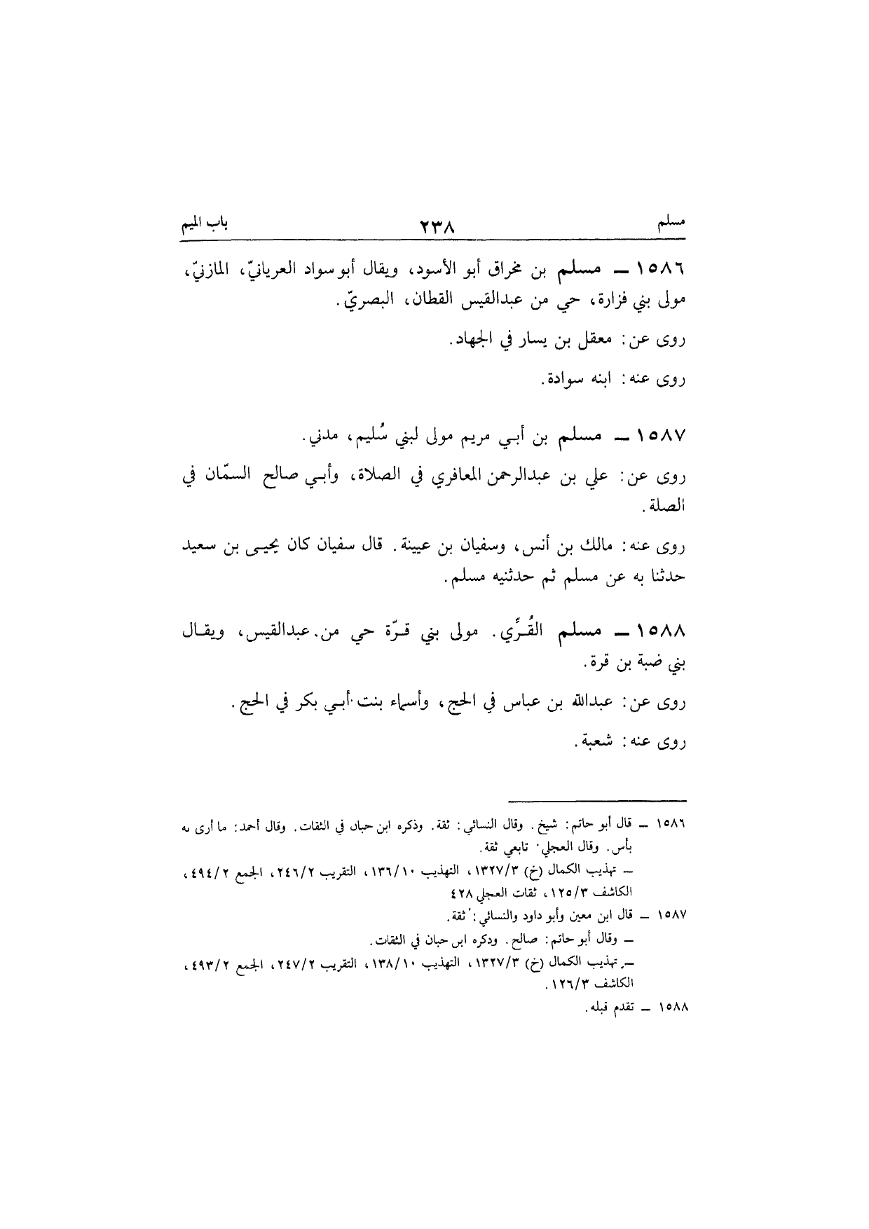 1586 - مُسلم بن مِخْرَاق أَبُو الْأسود وَيُقَال أَبُو سَواد العرياني الْمَازِني مولى بني فَزَارَة حَيّ من عبد القيس الْقطَّان الْبَصْرِيّ