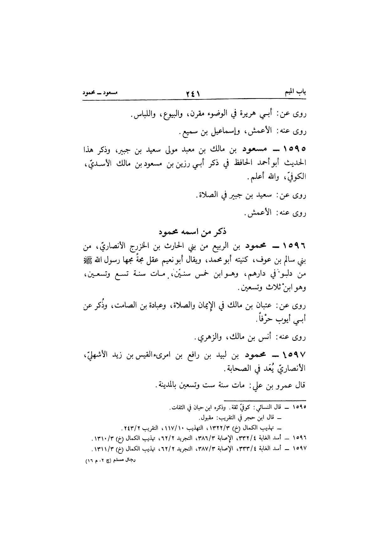 1596 - مَحْمُود بن الرّبيع بن بني الْحَارِث بن الْخَزْرَج الْأنْصَارِيّ من بني سَالم بن عَوْف كنيته أَبُو مُحَمَّد وَيُقَال أَبُو نعيم عقل مجة مجها رَسُول الله صلى الله عَلَيْهِ وَسلم من دلو فِي دَارهم وَهُوَ ابْن خمس سِنِين مَاتَ سنة تسع وَتِسْعين وَهُوَ ابْن ثَلَاث وَتِسْعين