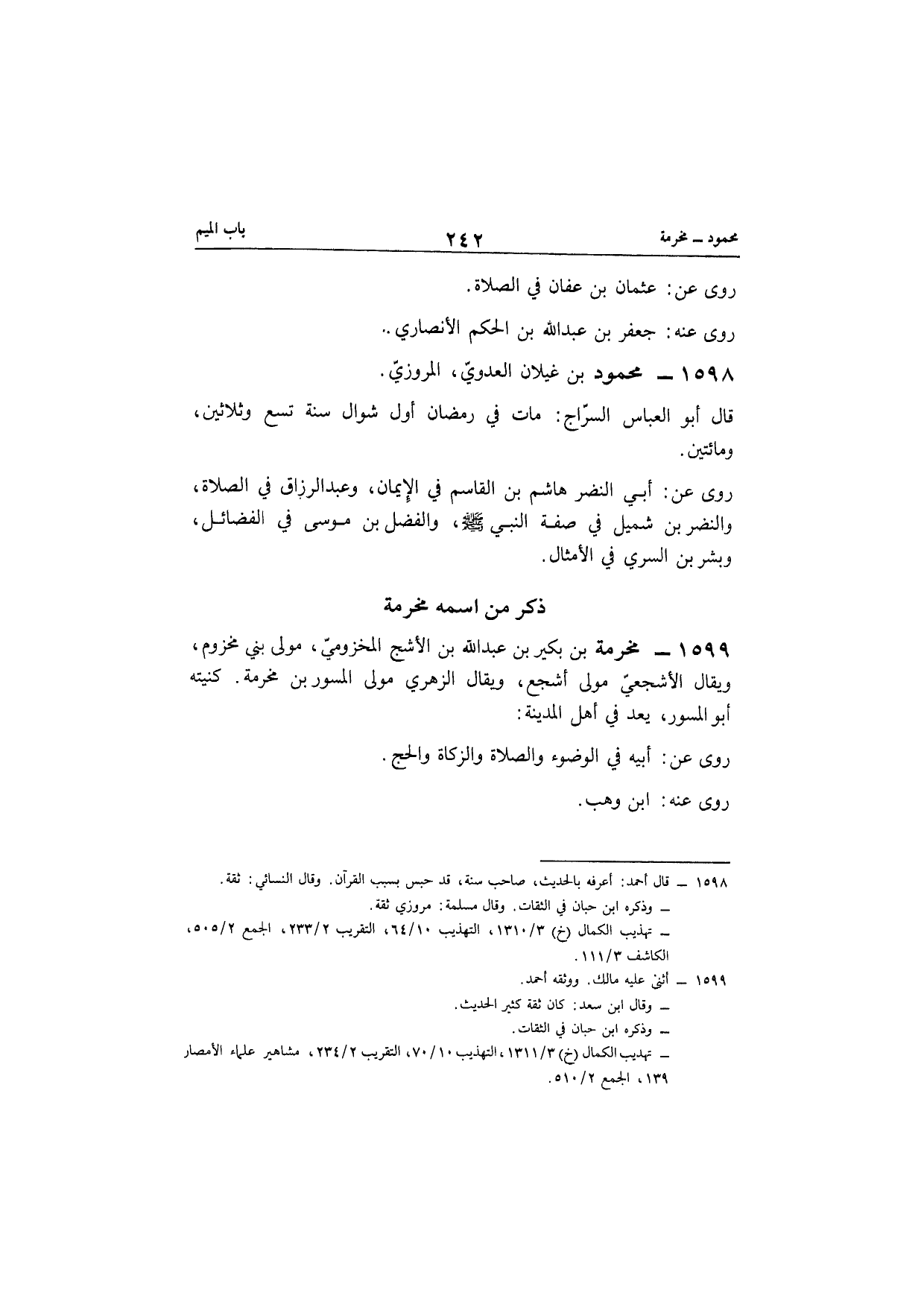 1599 - مخرمَة بن بكير بن عبد الله بن الْأَشَج المَخْزُومِي مولى بني مَخْزُوم وَيُقَال الْأَشْجَعِيّ مولى أَشْجَع وَيُقَال الزُّهْرِيّ مولى الْمسور بن مخرمَة كنيته أَبُو الْمسور يعد فِي أهل الْمَدِينَة