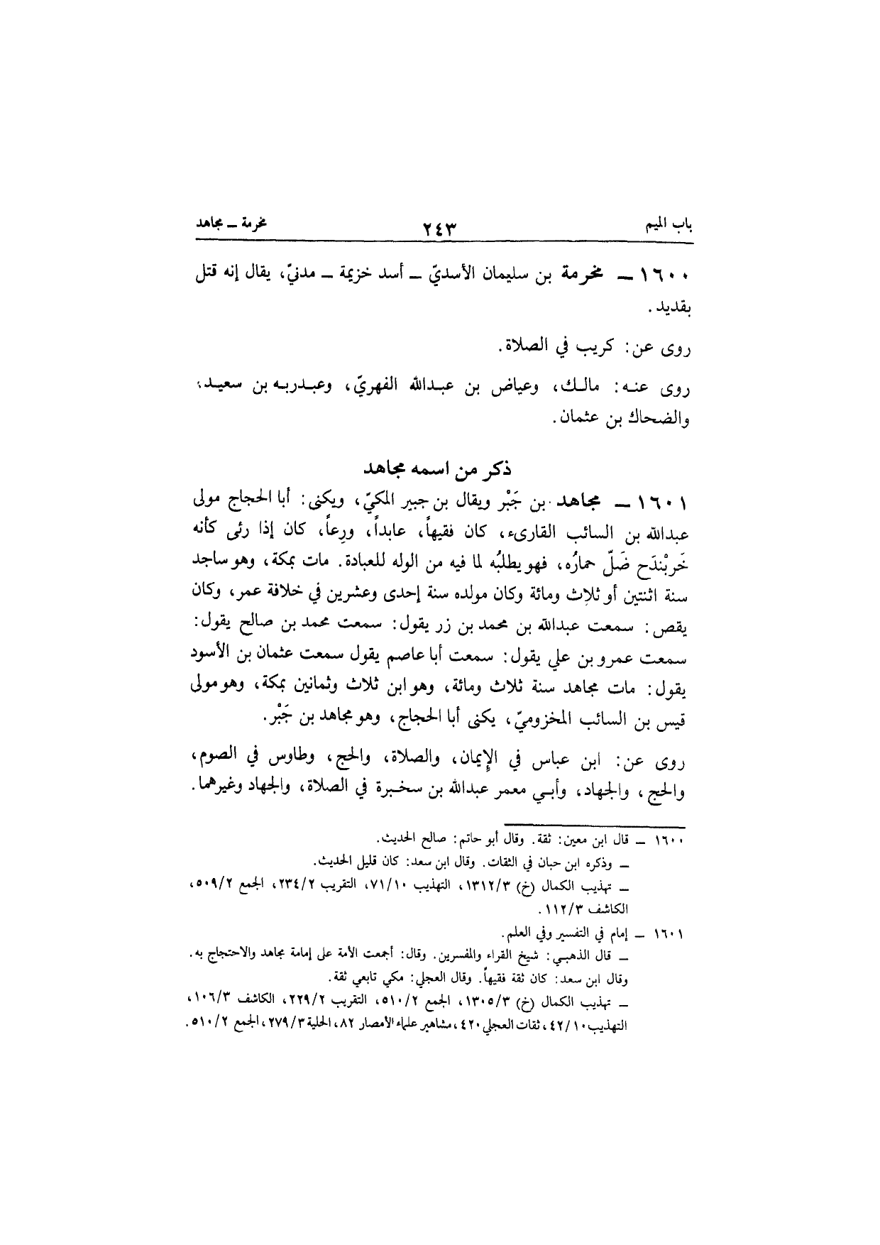 1601 - مُجَاهِد بن جبر وَيُقَال بن جُبَير الْمَكِّيّ ويكنى أَبَا الْحجَّاج مولى عبد الله بن السَّائِب القارىء كَانَ فَقِيها عابدا ورعا كَانَ إِذا رئى كَأَنَّهُ خربندح ضل حِمَاره فَهُوَ يَطْلُبهُ لما فِيهِ من الوله لِلْعِبَادَةِ مَاتَ بِمَكَّة وَهُوَ ساجد سنة اثْنَتَيْنِ أَو ثَلَاث وَمِائَة وَكَانَ مولده سنة إِحْدَى وَعشْرين فِي خلَافَة عمر وَكَانَ يقص سَمِعت عبد الله بن مُحَمَّد بن زر يَقُول سَمِعت مُحَمَّد بن صَالح يَقُول سَمِعت عَمْرو بن عَليّ يَقُول سَمِعت أَبَا عَاصِم يَقُول سَمِعت عُثْمَان بن الْأسود يَقُول مَاتَ مُجَاهِد سنة ثَلَاث وَمِائَة وَهُوَ ابْن ثَلَاث وَثَمَانِينَ بِمَكَّة وَهُوَ مولى قيس بن السَّائِب المَخْزُومِي يكنى ابا الْحجَّاج وَهُوَ مُجَاهِد بن جبر