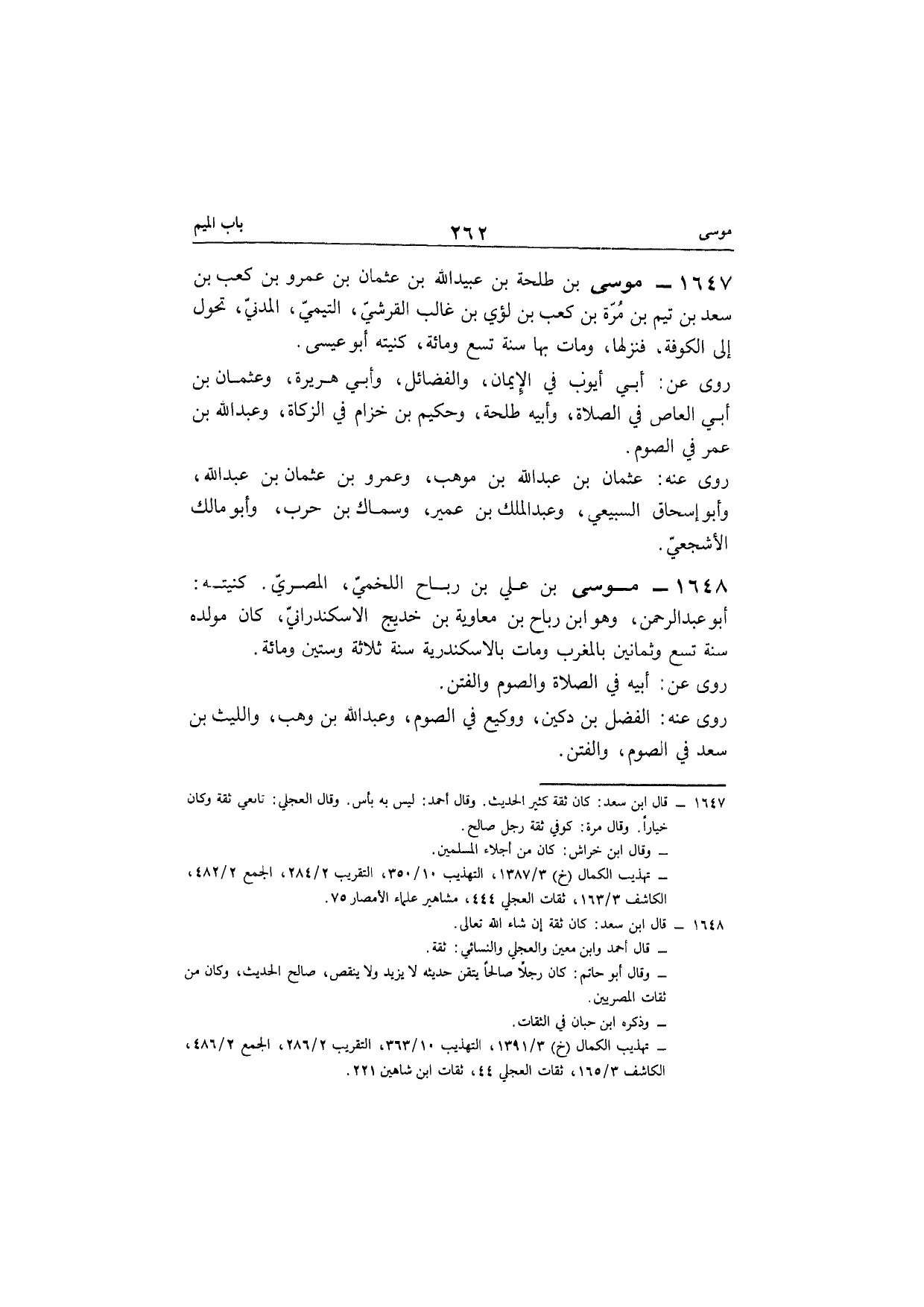 1647 - مُوسَى بن طَلْحَة بن عبيد الله بن عُثْمَان بن عَمْرو بن كَعْب بن سعد بن تيم بن مرّة بن كَعْب بن لؤَي بن غَالب الْقرشِي التَّيْمِيّ الْمدنِي تحول إِلَى الْكُوفَة فنزلها وَمَات بهَا سنة تسع وَمِائَة كنيته أَبُو عِيسَى