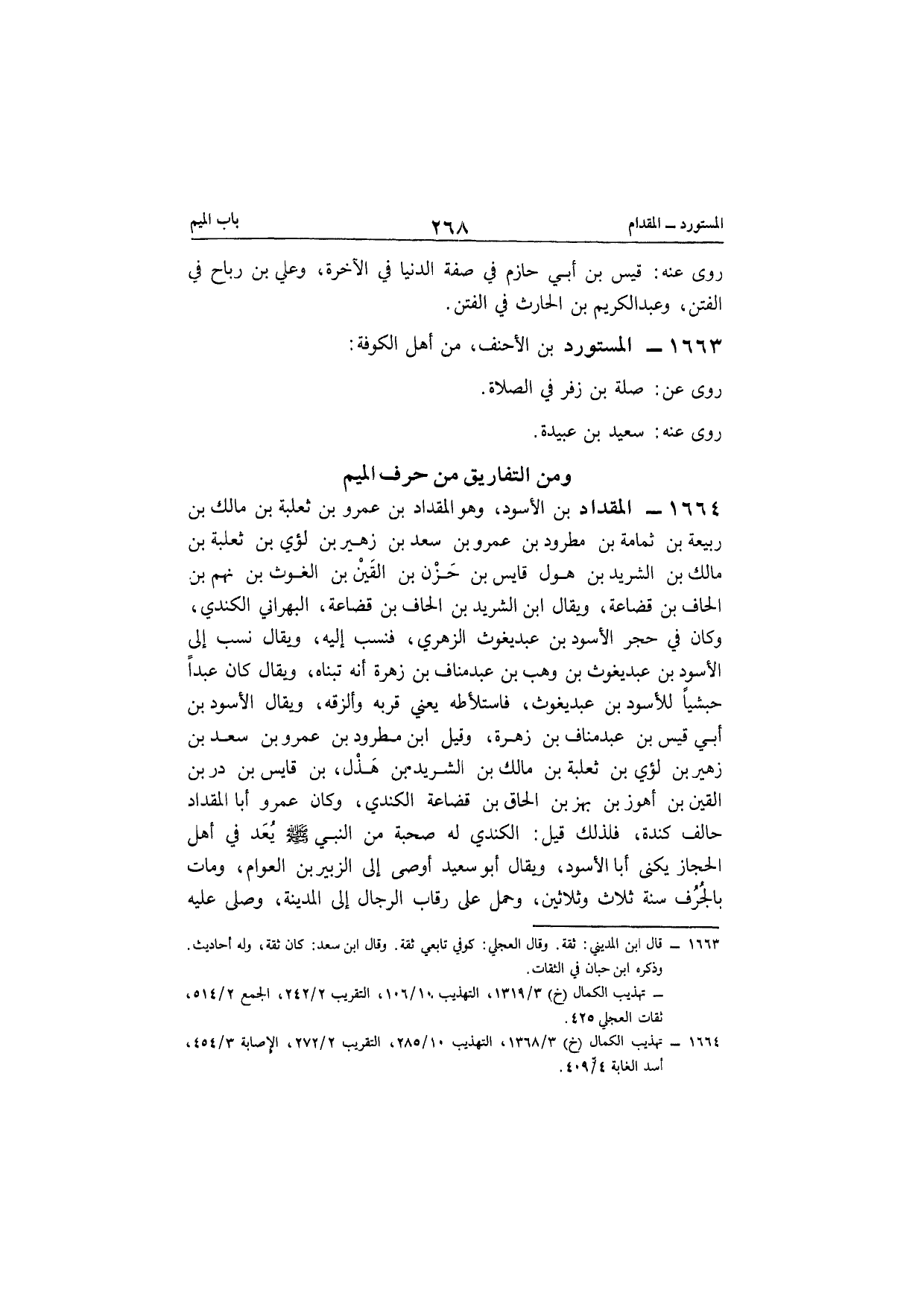 1664 - الْمِقْدَاد بن الْأسود وَهُوَ الْمِقْدَاد بن عَمْرو بن ثَعْلَبَة بن مَالك بن ربيعَة بن ثُمَامَة بن مطرود بن عَمْرو بن سعد بن زُهَيْر بن لؤَي بن ثَعْلَبَة بن مَالك بن الشريد بن هول قايس بن حزن بن الْقَيْن بن الْغَوْث بن نهم بن الحاف بن قضاعة وَيُقَال ابْن الشريد بن الحاف بن قضاعة البهراني الْكِنْدِيّ وَكَانَ فِي حجر الْأسود بن عبد يَغُوث الزُّهْرِيّ فنسب إِلَيْهِ وَيُقَال نسب إِلَى الْأسود بن عبد يَغُوث بن وهب بن عبد منَاف بن زهرَة أَنه تبناه وَيُقَال كَانَ عبدا حَبَشِيًّا للأسود بن عبد يَغُوث فاستلأطه يَعْنِي قربه وألزقه وَيُقَال الْأسود بن أبي قيس بن عبد منَاف بن زهرَة وَقيل ابْن مطرود بن عَمْرو بن سعد بن زُهَيْر بن لؤَي بن ثَعْلَبَة بن مَالك بن الشريد بن هذل بن قايس بن در بن الْقَيْن بن أهوز بن بهز بن الحاق بن قضاعة الْكِنْدِيّ وَكَانَ عَمْرو أَبَا الْمِقْدَاد حَالف كِنْدَة فَلذَلِك قيل الْكِنْدِيّ لَهُ صُحْبَة من النَّبِي صلى الله عَلَيْهِ وَسلم يعد فِي أهل الْحجاز يكنى أَبَا الْأسود وَيُقَال أَبُو سعيد أوصى إِلَى الزبير بن الْعَوام وَمَات بالجرف سنة ثَلَاث وَثَلَاثِينَ وَحمل على رِقَاب الرِّجَال إِلَى الْمَدِينَة وَصلى عَلَيْهِ