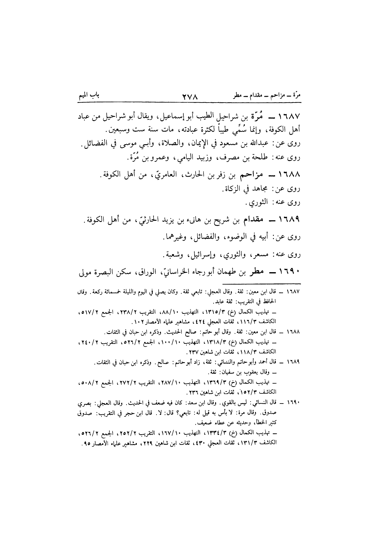 1687 - مرّة بن شرَاحِيل الطّيب أَبُو إِسْمَاعِيل وَيُقَال أَبُو شرَاحِيل من عباد أهل الْكُوفَة وَإِنَّمَا سمي طيبا لِكَثْرَة عِبَادَته مَاتَ سنة سِتّ وَسبعين