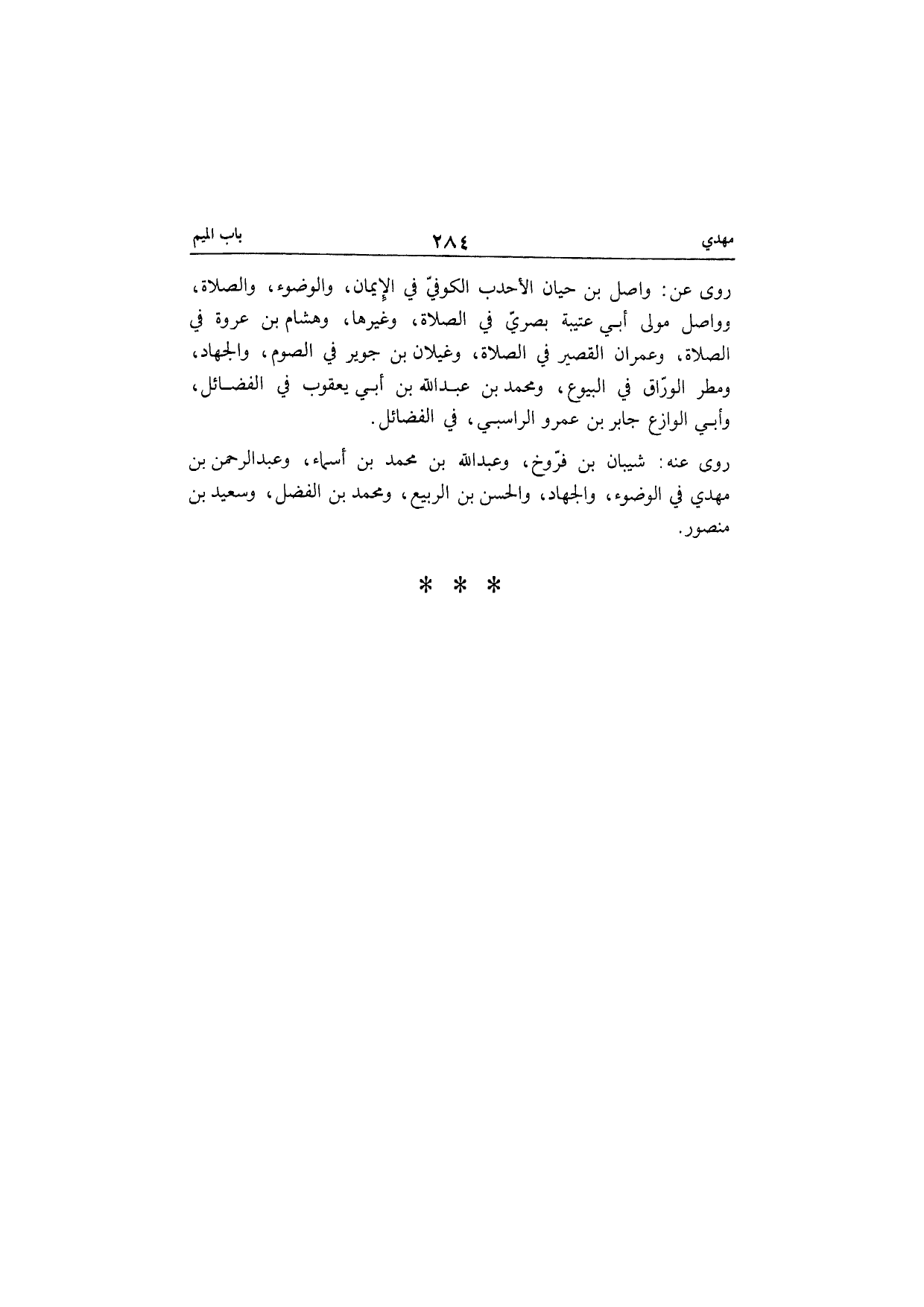 روى عَن وَاصل بن حَيَّان الأحدب الْكُوفِي فِي الْإِيمَان وَالْوُضُوء وَالصَّلَاة وواصل مولى أبي عتيبة بَصرِي فِي الصَّلَاة وَغَيرهَا وَهِشَام بن عُرْوَة فِي الصَّلَاة وَعمْرَان الْقصير فِي الصَّلَاة وغيلان بن جوير فِي الصَّوْم وَالْجهَاد ومطر الْوراق فِي الْبيُوع وَمُحَمّد بن عبد الله بن أبي يَعْقُوب فِي الْفَضَائِل وَأبي الوزاع جَابر بن عَمْرو الرَّاسِبِي فِي الْفَضَائِل