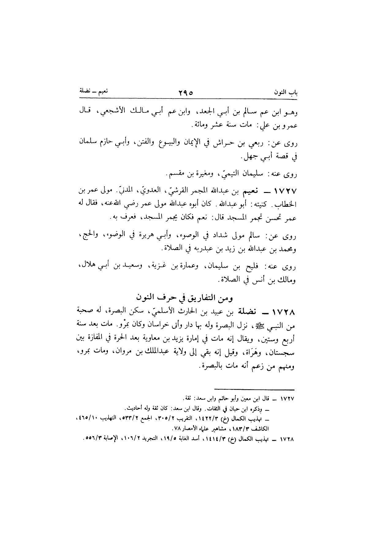 1728 - نَضْلَة بن عبيد بن الْحَارِث الْأَسْلَمِيّ سكن الْبَصْرَة لَهُ صُحْبَة من النَّبِي صلى الله عَلَيْهِ وَسلم نزل الْبَصْرَة وَله بهَا دَار وأتى خُرَاسَان وَكَانَ بمرو مَاتَ بعد سنة أَربع وَسِتِّينَ وَيُقَال إِنَّه مَاتَ فِي إِمَارَة يزِيد بن مُعَاوِيَة بعد الْحرَّة فِي الْمَفَازَة بَين سجستان وهراة وَقيل إِنَّه بَقِي إِلَى ولَايَة عبد الملك بن مَرْوَان وَمَات بمرو وَمِنْهُم من زعم أَنه مَاتَ بِالْبَصْرَةِ