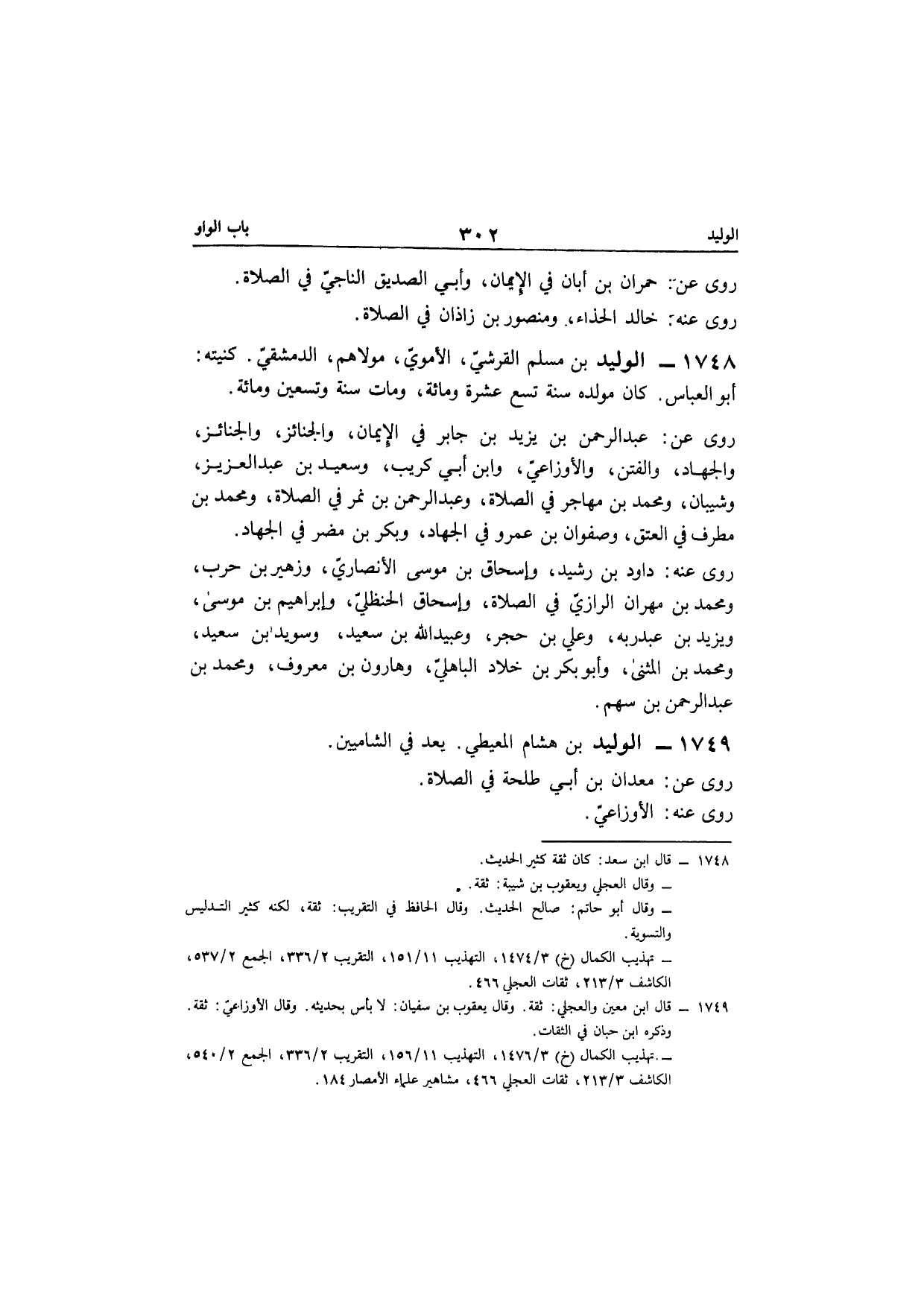 1748 - الْوَلِيد بن مُسلم الْقرشِي الْأمَوِي مَوْلَاهُم الدِّمَشْقِي كنيته أَبُو الْعَبَّاس كَانَ مولده سنة تسع عشرَة وَمِائَة وَمَات سنة وَتِسْعين وَمِائَة