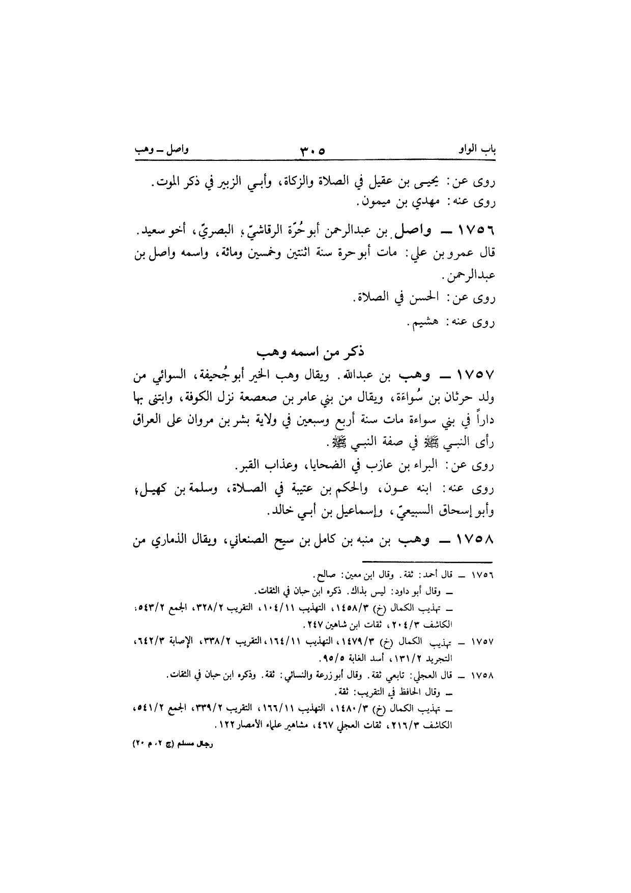 1758 - وهب بن مُنَبّه بن كَامِل بن سيح الصَّنْعَانِيّ وَيُقَال الذمارِي من أَبنَاء فَارس والذمار قَرْيَة من قرى صنعاء على مرحلَتَيْنِ مِنْهَا كنيته أَبُو عبد الله وَكَانَ عابدا فَاضلا قَرَأَ الْكتب مَاتَ سنة ثَلَاث أَو أَربع عشر وَمِائَة وَهُوَ ابْن ثَمَانِينَ سنة