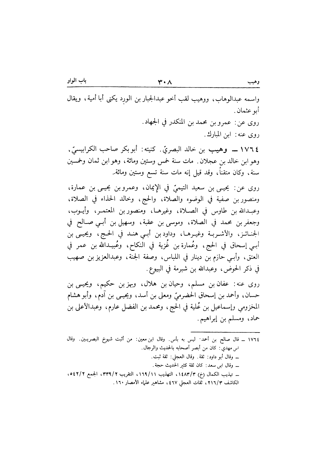 1764 - وهيب بن خَالِد الْبَصْرِيّ كنيته أَبُو بكر صَاحب الْكَرَابِيسِي وَهُوَ ابْن خَالِد بن عجلَان مَاتَ سنة خمس وَسِتِّينَ وَمِائَة وَهُوَ ابْن ثَمَان وَخمسين سنة وَكَانَ متقنا وَقد قيل إِنَّه مَاتَ سنة تسع وَسِتِّينَ وَمِائَة