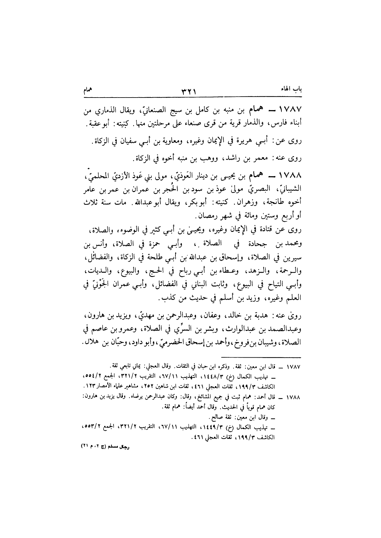 1788 - همام بن يحيى بن دِينَار العوذي مولى بني عوذ الْأَزْدِيّ المحلمي الشَّيْبَانِيّ الْبَصْرِيّ مولى عوذ بن سود بن الْحجر بن عمرَان بن عمر بن عَامر أَخُوهُ طانجة وزهران كنيته أَبُو بكر وَيُقَال أَبُو عبد الله مَاتَ سنة ثَلَاث أَو أَربع وَسِتِّينَ وَمِائَة فِي شهر رَمَضَان