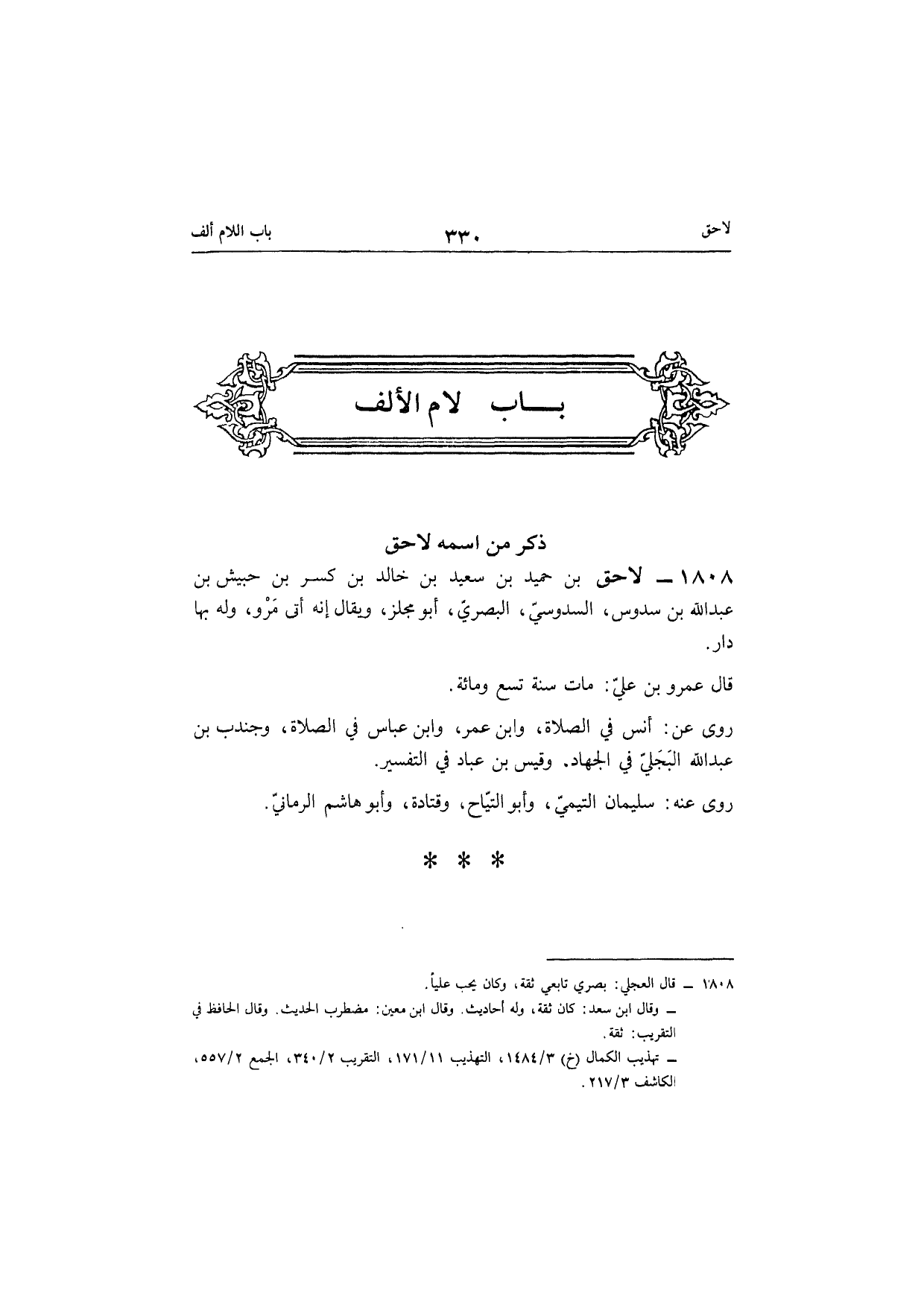 1808 - لَاحق بن حميد بن سعيد بن خَالِد بن كسر بن جبيش بن عبد الله بن سدوس السدُوسِي الْبَصْرِيّ أَبُو مجلز وَيُقَال إِنَّه أَتَى مرو وَله بهَا دَار