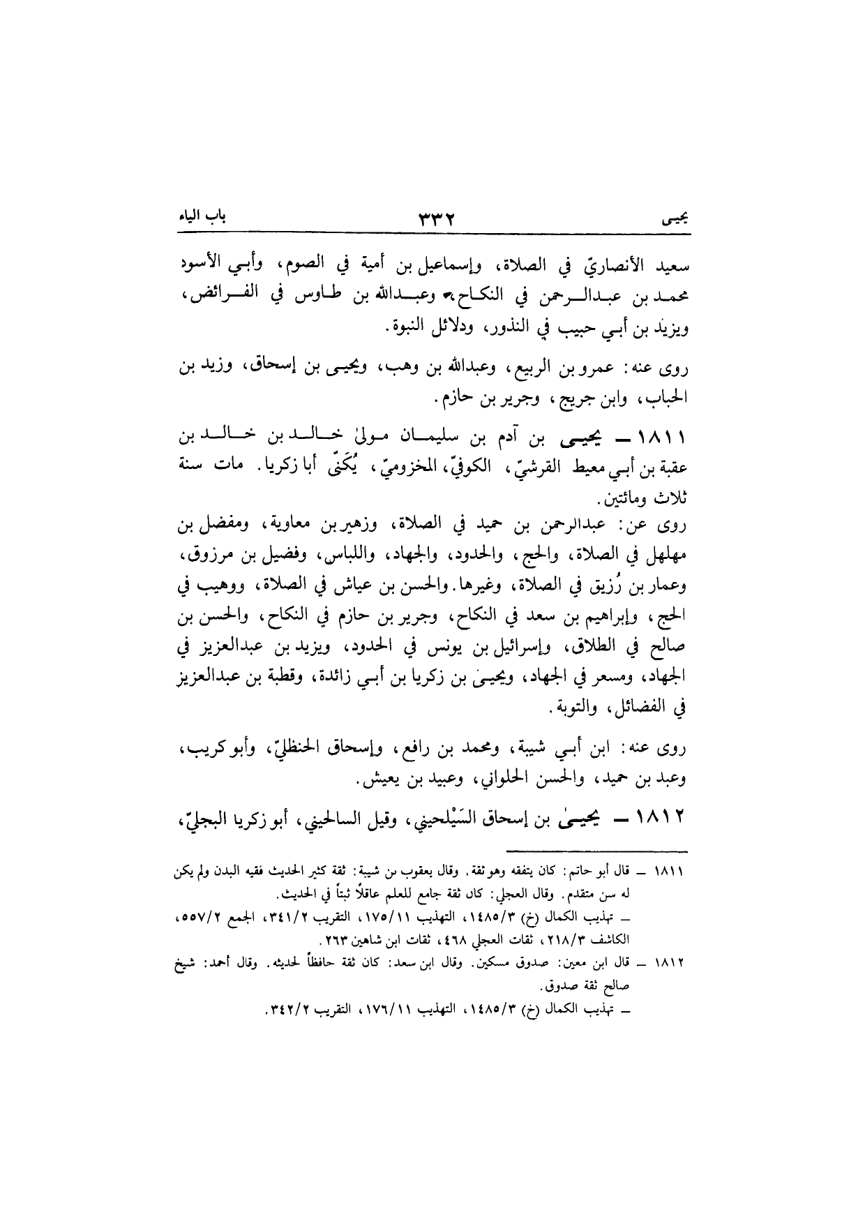 1811 - يحيى بن آدم بن سُلَيْمَان مولى خَالِد بن خَالِد بن عقبَة بن أبي معيط الْقرشِي الْكُوفِي المَخْزُومِي يكنى أَبَا زَكَرِيَّا مَاتَ سنة ثَلَاث وَمِائَتَيْنِ