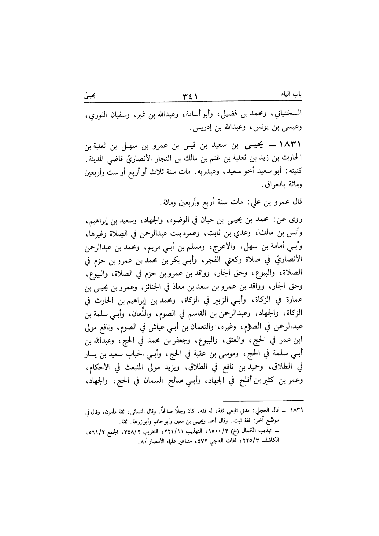 1831 - يحيى بن سعيد بن قيس بن عَمْرو بن سهل بن ثَعْلَبَة بن الْحَارِث بن زيد بن ثَعْلَبَة بن غنم بن مَالك بن النجار الْأنْصَارِيّ قَاضِي الْمَدِينَة كنيته أَبُو سعيد أَخُو سعيد وعبدربه مَاتَ سنة ثَلَاث أَو أَربع أَو سِتّ وَأَرْبَعين وَمِائَة بالعراق