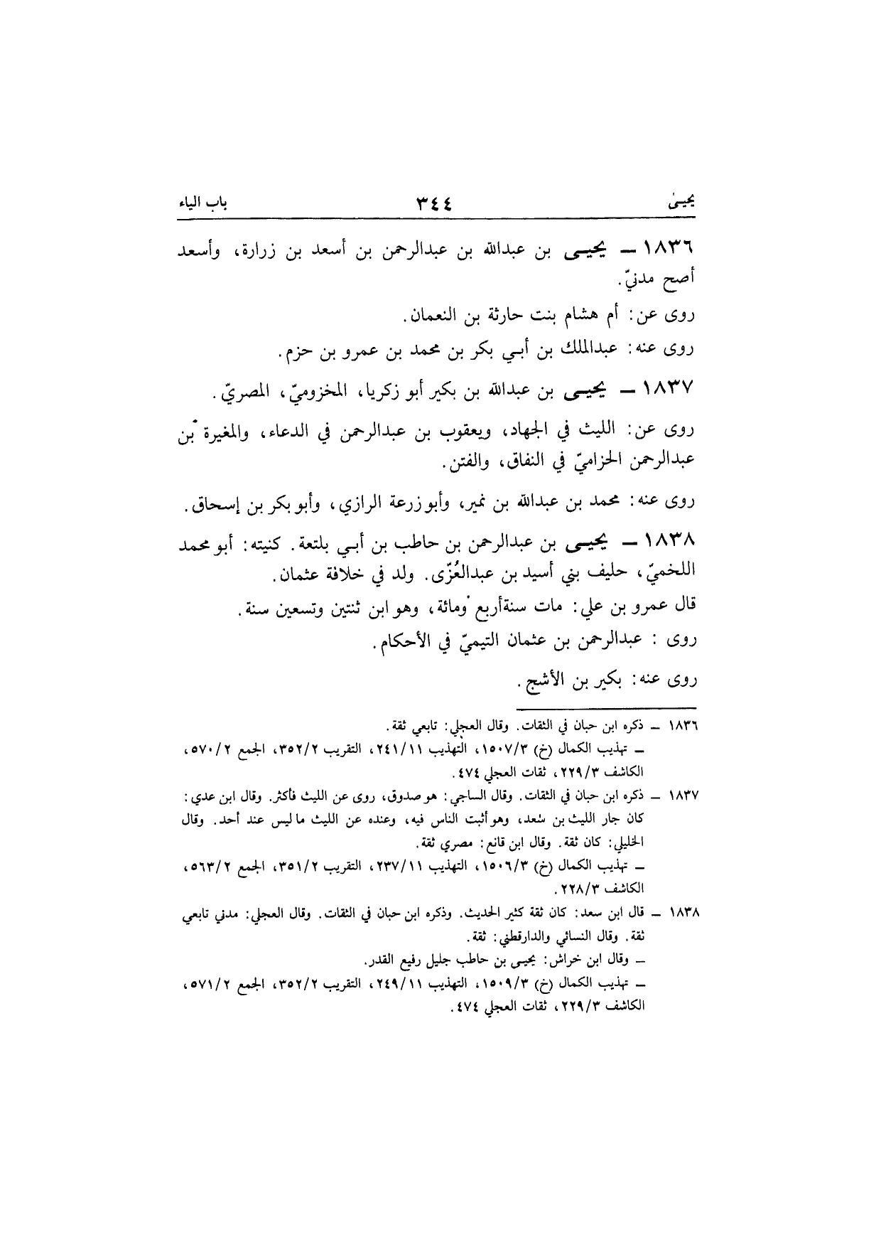 1838 - يحيى بن عبد الرحمن بن حَاطِب بن أبي بلتعة كنيته أَبُو مُحَمَّد اللَّخْمِيّ حَلِيف بني أسيد بن عبد العزى ولد فِي خلَافَة عُثْمَان
