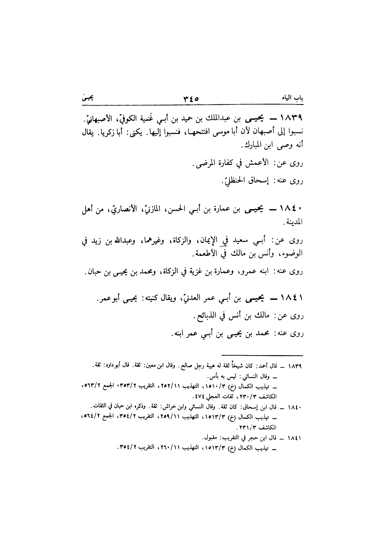 1839 - يحيى بن عبد الملك بن حميد بن أبي غنية الْكُوفِي الْأَصْبَهَانِيّ نسبوا إِلَى أَصْبَهَان لِأَن أَبَا مُوسَى افتتحها فنسبوا إِلَيْهَا يكنى أَبَا زَكَرِيَّا يُقَال أَنه وصّى ابْن الْمُبَارك