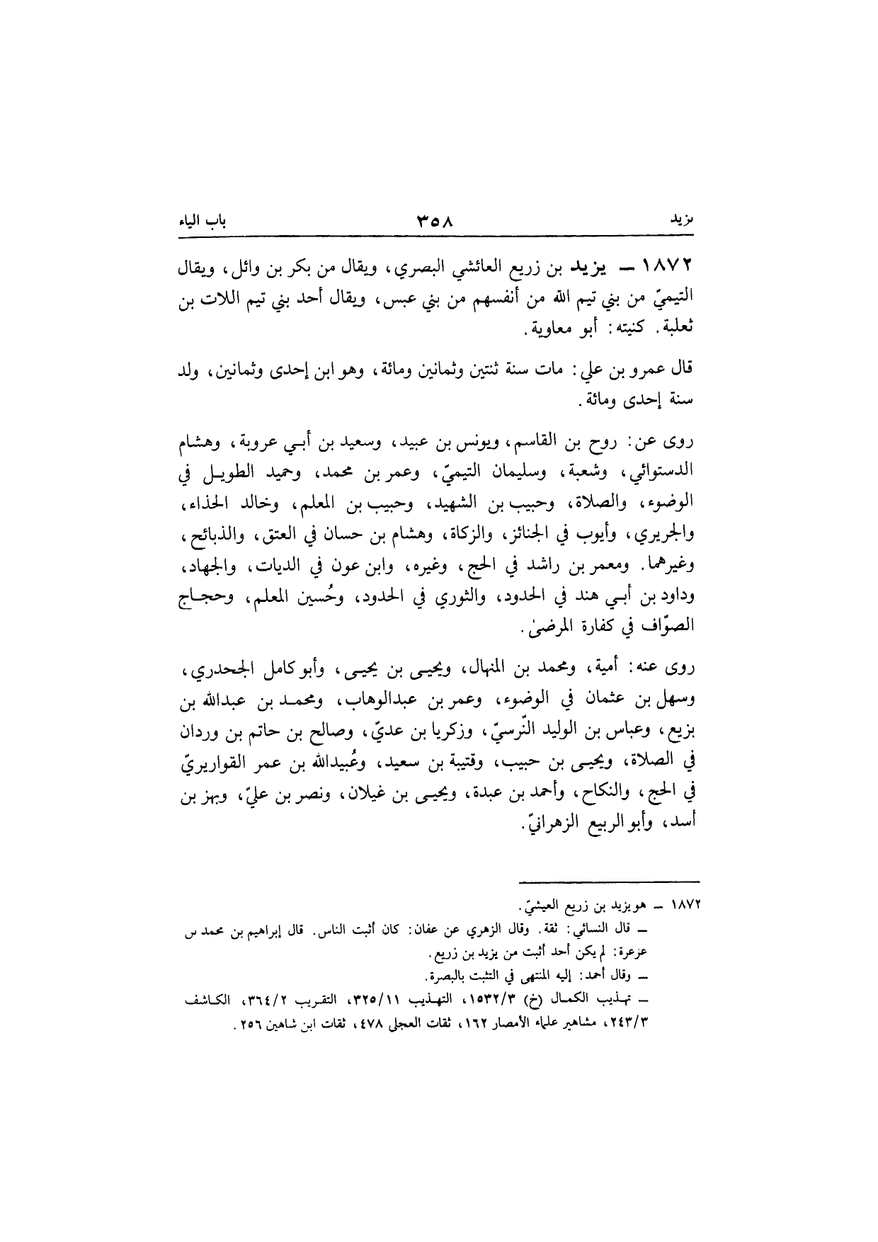 1872 - يزِيد بن زُرَيْع العائشي الْبَصْرِيّ وَيُقَال من بكر بن وَائِل وَيُقَال التَّيْمِيّ من بني تيم الله من أنفسهم من بني عبس وَيُقَال أحد بني تيم اللات بن ثَعْلَبَة كنيته أَبُو مُعَاوِيَة
