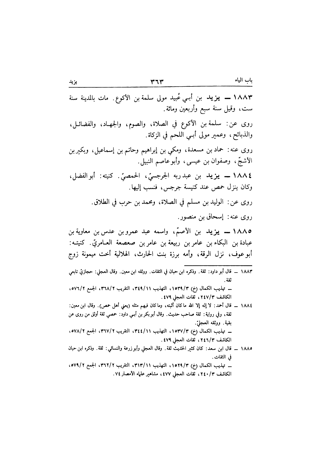 1883 - يزِيد بن أبي عبيد مولى سَلمَة بن الْأَكْوَع مَاتَ بِالْمَدِينَةِ سنة سِتّ وَقيل سنة سبع وَأَرْبَعين وَمِائَة
