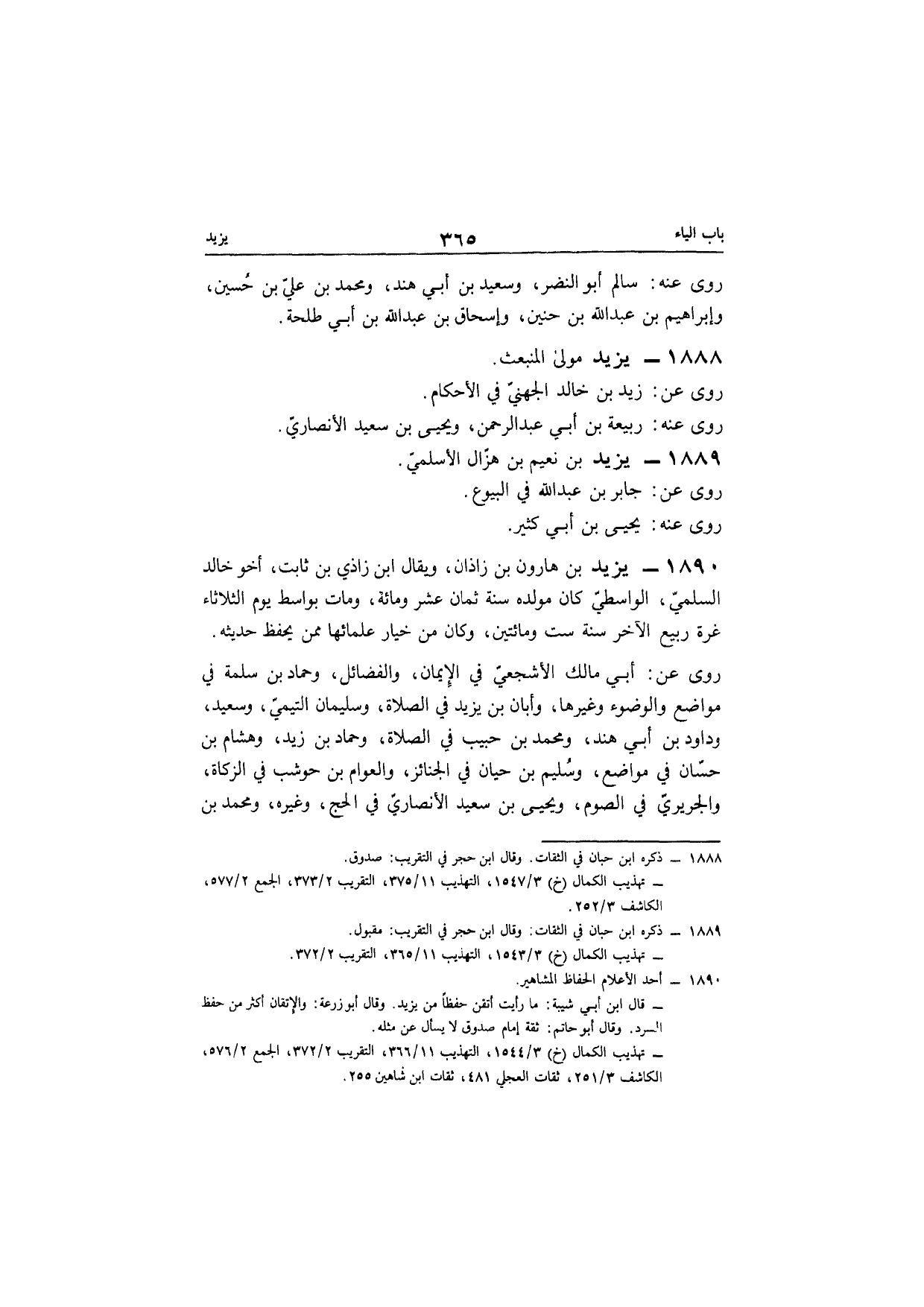1890 - يزِيد بن هَارُون بن زَاذَان وَيُقَال ابْن زاذي بن ثَابت أَخُو خَالِد السّلمِيّ الوَاسِطِيّ كَانَ مولده سنة ثَمَان عشرَة وَمِائَة وَمَات بواسط يَوْم الثُّلَاثَاء غرَّة ربيع الآخر سنة سِتّ وَمِائَتَيْنِ وَكَانَ من خِيَار علمائها مِمَّن يحفظ حَدِيثه