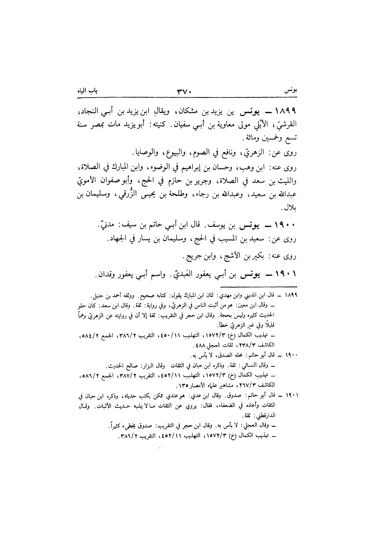 1899 - يُونُس ين يزِيد بن مشكان وَيُقَال ابْن يزِيد بن أبي النجاد الْقرشِي الْأَيْلِي مولى مُعَاوِيَة بن أبي سُفْيَان كنيته أَبُو يزِيد مَاتَ بِمصْر سنة تسع وَخمسين وَمِائَة