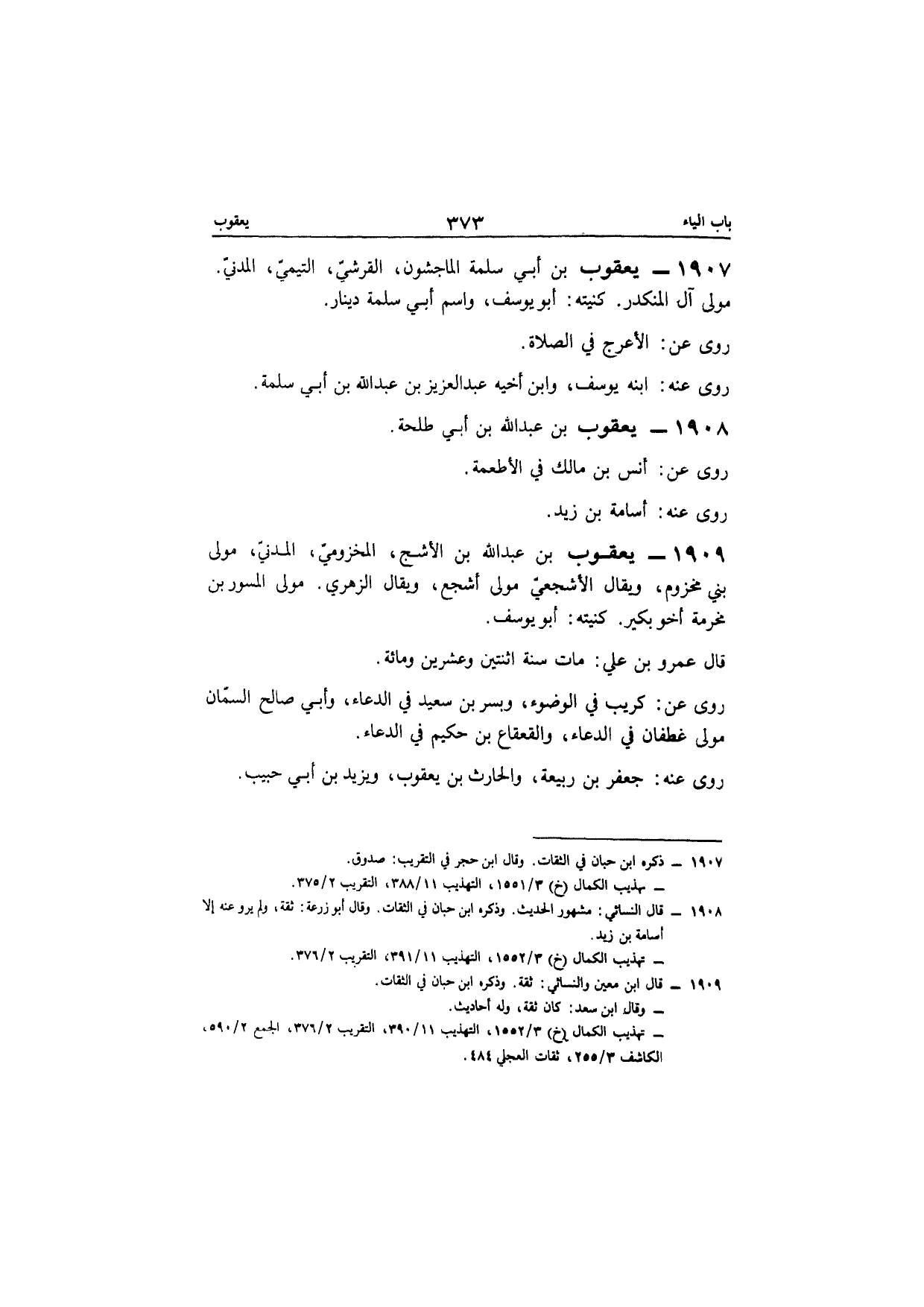 1907 - يَعْقُوب بن أبي سَلمَة الْمَاجشون الْقرشِي التَّيْمِيّ الْمدنِي مولى آل الْمُنْكَدر كنيته أَبُو يُوسُف وَاسم أبي سَلمَة دِينَار