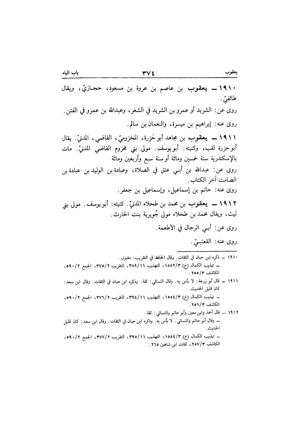 1910 - يَعْقُوب بن عَاصِم بن عُرْوَة بن مَسْعُود حجازي وَيُقَال طائفي