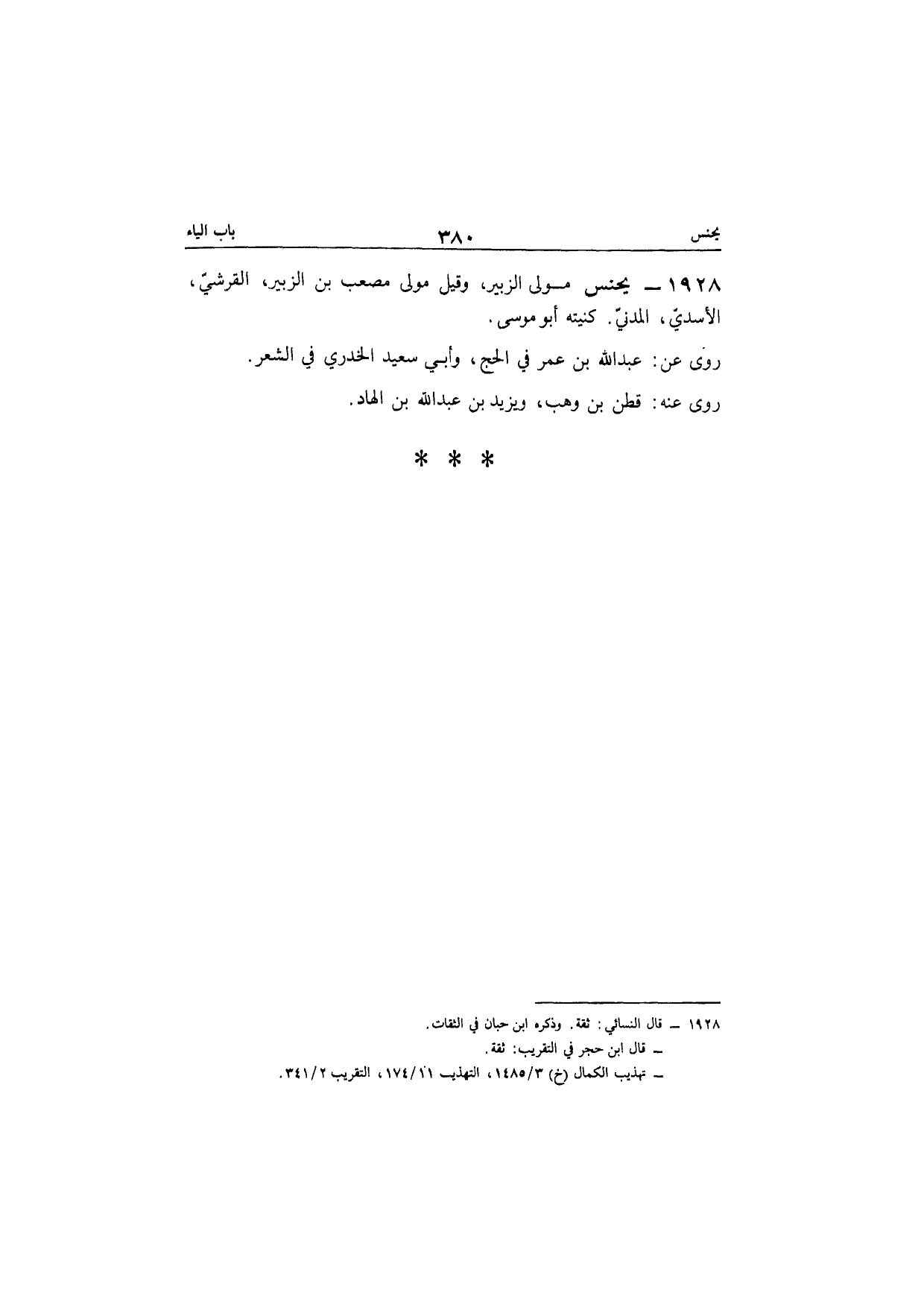 1928 - يحنس مولى الزبير وَقيل مولى مُصعب بن الزبير الْقرشِي الْأَسدي الْمدنِي كنيته أَبُو مُوسَى
