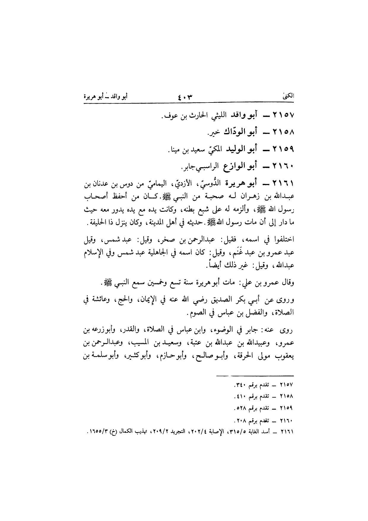2161 - أَبُو هُرَيْرَة الدوسي الْأَزْدِيّ اليمامي من دوس بن عدنان بن عبد الله بن زهران لَهُ صُحْبَة من النَّبِي صلى الله عَلَيْهِ وَسلم كَانَ من أحفظ أَصْحَاب رَسُول الله صلى الله عَلَيْهِ وَسلم وألزمه لَهُ على شبع بَطْنه وَكَانَت يَده مَعَ يَده يَدُور مَعَه حَيْثُ مَا دَار إِلَى أَن مَاتَ رَسُول الله صلى الله عَلَيْهِ وَسلم حَدِيثه فِي أهل الْمَدِينَة وَكَانَ ينزل ذَا الحليفة اخْتلفُوا فِي اسْمه فَقيل عبد الرحمن بن صَخْر وَقيل عبد شمس وَقيل عبد عَمْرو بن عبد غنم وَقيل كَانَ اسْمه فِي الْجَاهِلِيَّة عبد شمس وَفِي الْإِسْلَام عبد الله وَقيل غير ذَلِك أَيْضا